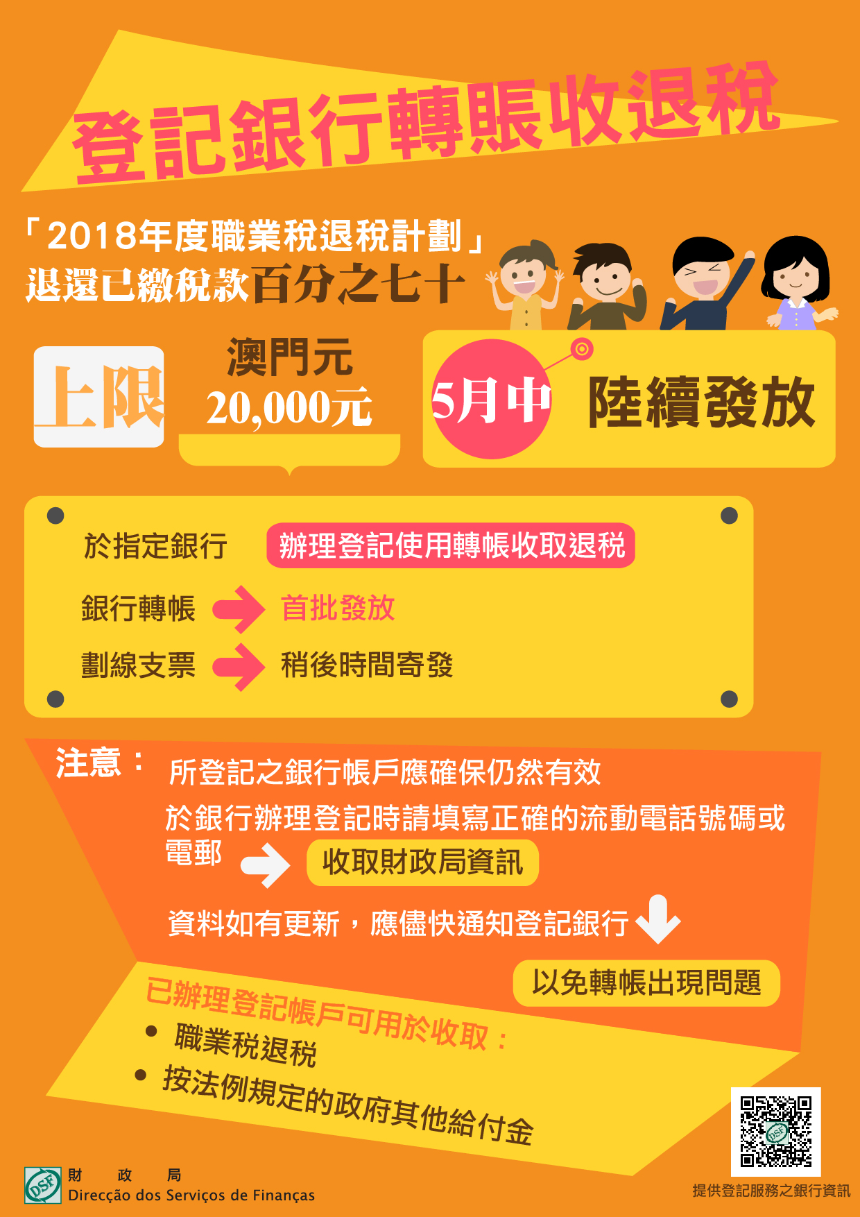 「2018年度職業稅退稅計劃」款項將於5月中陸續退予符合資格職業稅納稅人,首批先向已於指定銀行辦理登記使用轉帳收取退稅的納稅人,退還已繳稅款百分之七十,上限為澳門元20,000元。未辦理登記者,退稅款項會於稍後時間以郵寄劃線支票或結算單退回。