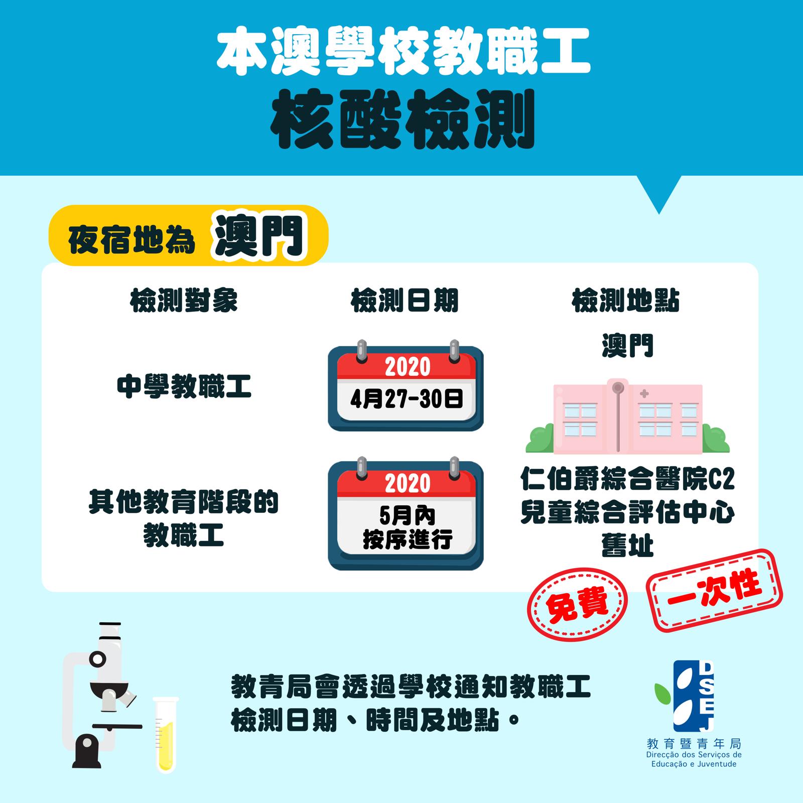本澳非高等教育的教職工,將在本澳仁伯爵綜合醫院的兒童綜合評估中心舊址接受一次性檢測;而跨境教職工和學生則在珠海接受檢測。計劃將分階段進行,4月27至30日,為任職中學的教職工率先進行,確保高中和初中順利復課。而其他教育階段的教職工,將配合復課安排,稍後按序進行。