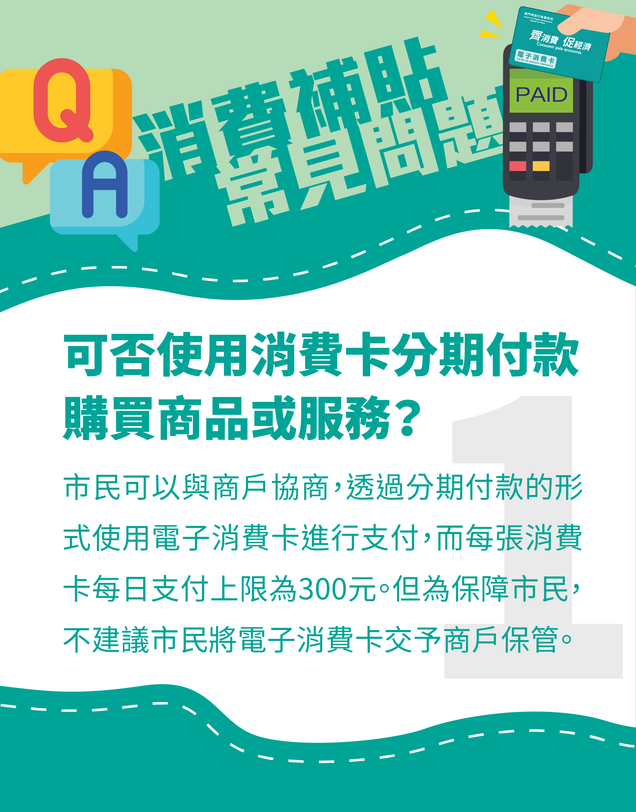 市民可以與商戶協商,透過分期付款的形式使用電子消費卡進行支付,而每張消費卡每日支付上限為300元。但為保障市民,不建議市民將電子消費卡交予商戶保管。
