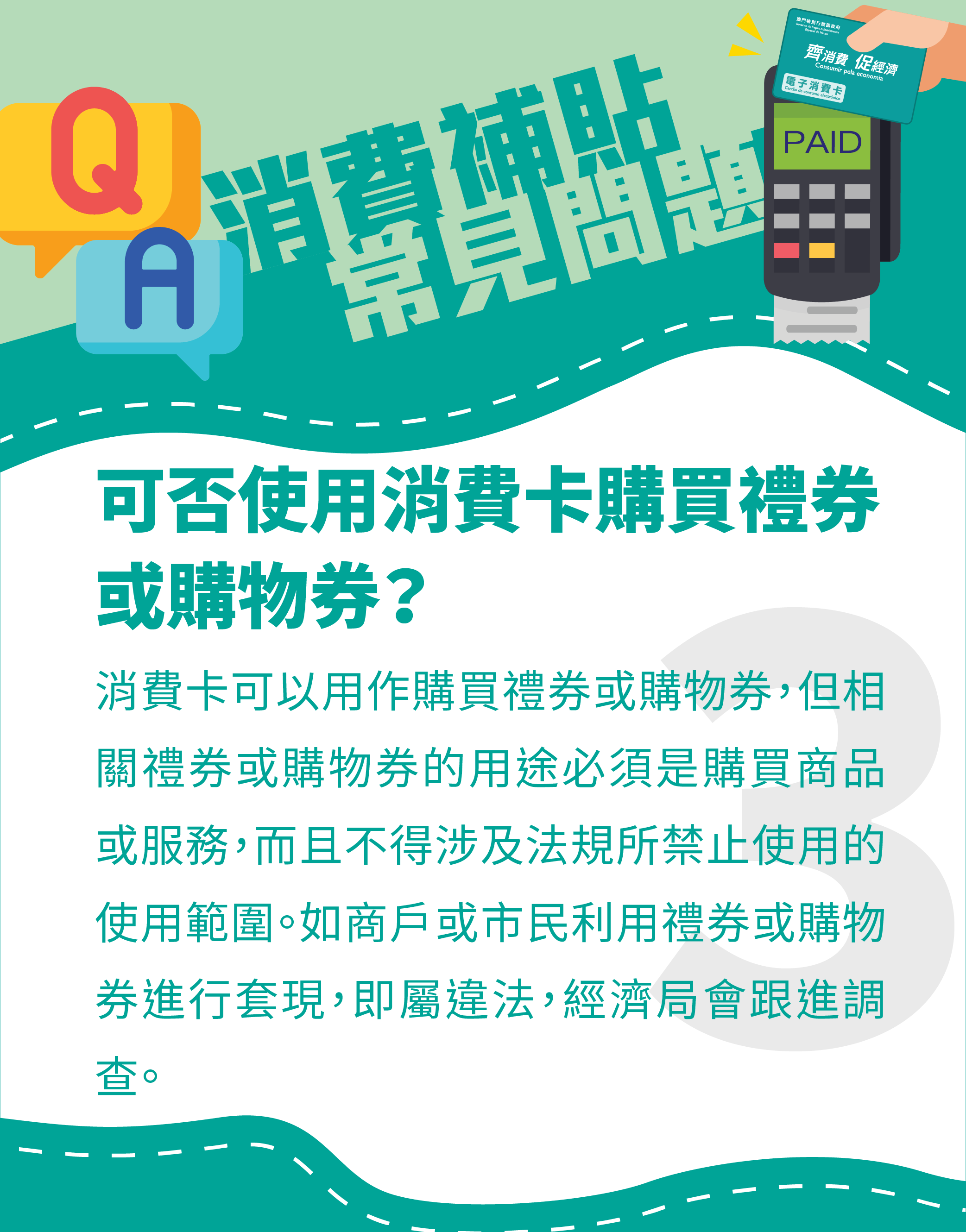 消費卡可以用作購買禮券或購物券,但相關禮券或購物券的用途必須是購買商品或服務,而且不得涉及法規所禁止使用的使 用範圍。如商戶或市民利用禮券或購物券進行套現,即屬違法,經濟局會跟進調查。