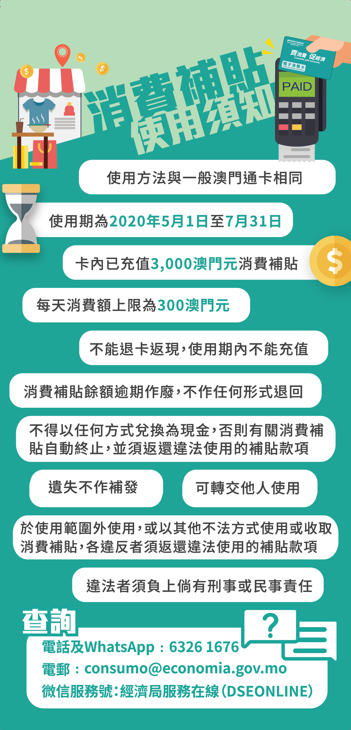 消費卡即將於5 月1日起開始使用,至7月31日結束,未使用的餘額將退回庫房;屆時居民可持電子消費卡到設有相關電子支付機具的商戶消費,期望透過廣大居民的消費行為,惠及各行各業的中小企業。