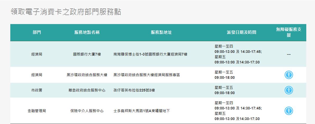 經濟局提醒,未領卡的居民須於7月17日或之前的辦公時間內(最早的辦公日為5月4日)到以下四個指定政府服務點領卡:
