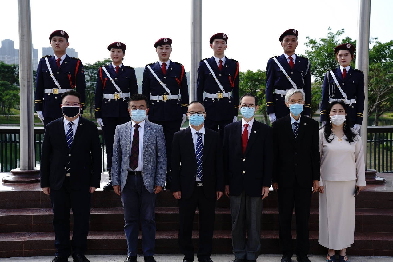 “齊心抗疫•立志精進” 五四青年節升旗儀式今天上午八時在澳大行政樓前蓮花廣場舉行,澳大校長宋永華、副校長蘇基朗、學生事務長彭執中、校長辦公室主任汪淇、全球事務總監甄勇、學生資源處處長張學森等出席。原本能容納幾千名學生的蓮花廣場雖然只有寥寥數人,但澳大師生同一時間在書院、研究生宿舍、辦公樓或家中,通過手機、電腦等多媒體螢幕,共同參與這場莊嚴而特殊的“雲直播”升旗儀式。“請全體肅立,升國旗,奏唱國歌!”在隊長張帝的口令下,伴隨著雄壯的國歌,五星紅旗、區旗和澳大校旗冉冉升起。而澳大師生們在不同空間、同一時刻,起身肅立,同唱國歌。