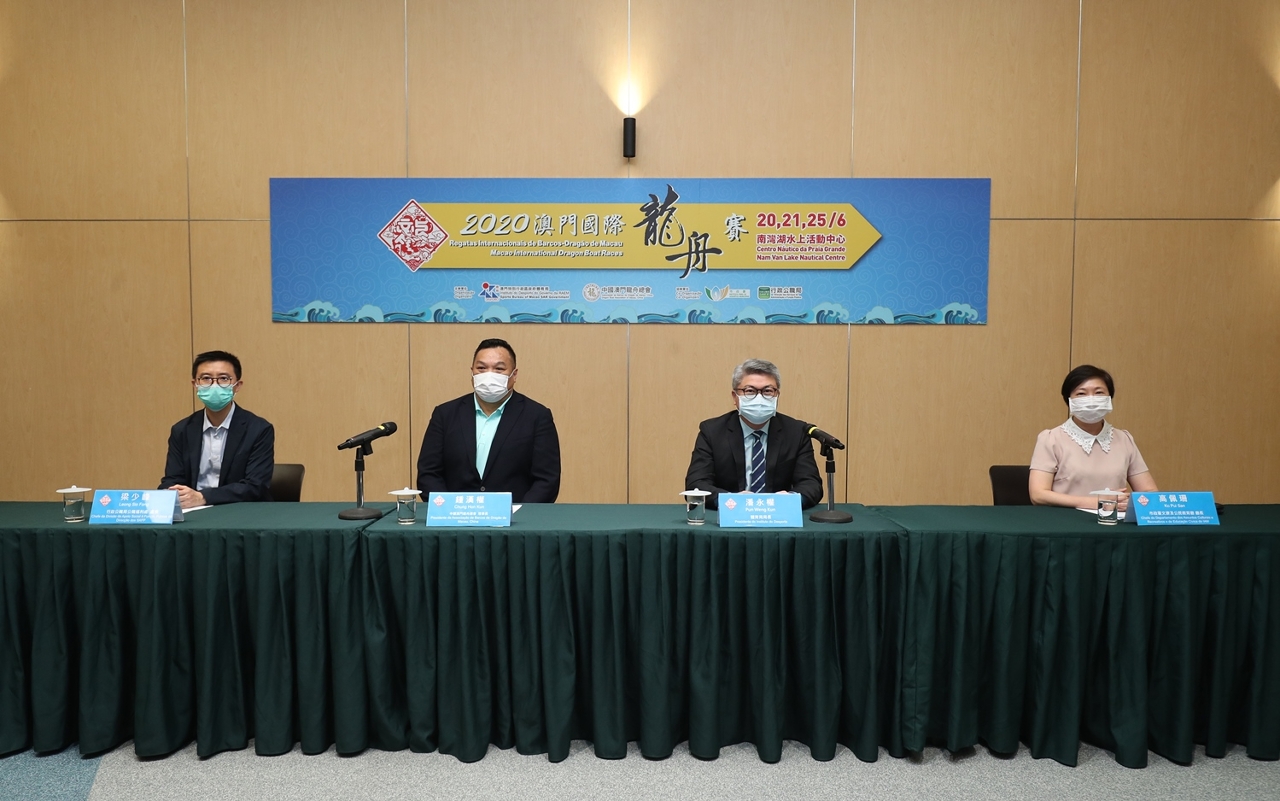 由體育局及中國澳門龍舟總會主辦,市政署及行政公職局協辦的 “2020澳門國際龍舟賽”活動,將於本年6月20日、21日及25日在南灣湖水上活動中心舉行。賽事組委會今日(5日)舉行新聞發佈會,介紹活動詳情。出席新聞發佈會的嘉賓包括體育局局長潘永權、中國澳門龍舟總會理事長鍾漢權、市政署文康及公民教育廳廳長高佩珊、行政公職局公職福利處處長梁少峰、體育局副局長劉楚遠及林蓮嬌。