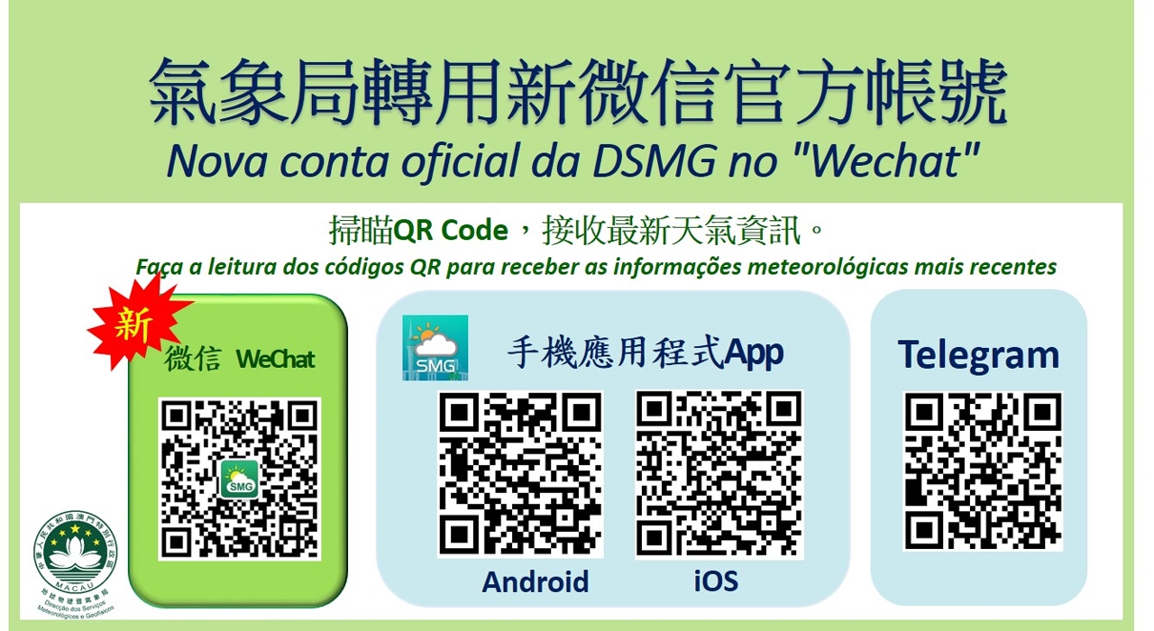 因應業務發展與微信粉絲用戶不斷增加,地球物理暨氣象局早前推出了新微信官方帳號“澳門地球物理暨氣象局SMG”,以配合服務發展;同時舊版微信官方帳號“澳門氣象局SMG”將於本月31日起停止提供服務。