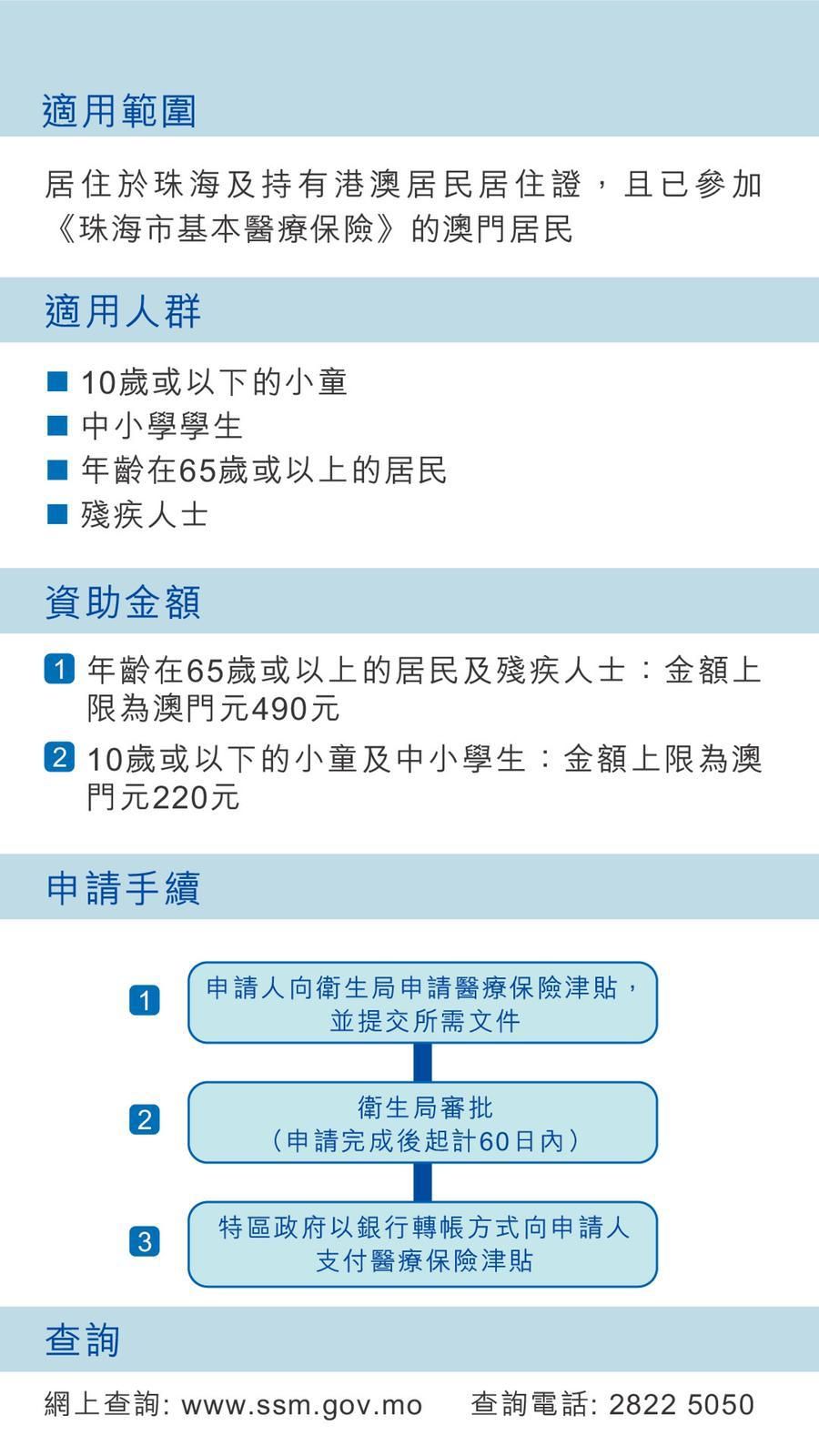 根據同日公佈的第121/2020號行政長官批示及第122/2020號行政長官批示,法規所指的內地地區為珠海市,醫療保險津貼金額分別為:年齡為六十五歲或以上、具條件申請發放殘疾津貼的殘疾人士的上限為澳門元490元,十歲或以下、中小學教育的學生的上限為澳門元220元。