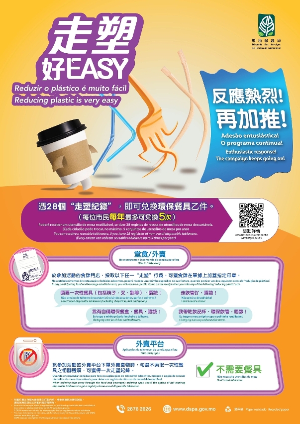 如欲加入成為“走塑好Easy”活動的參與食肆或飲料店,或希望瞭解活動詳情,請瀏覽環保局網頁(www.dspa.gov.mo)或致電“環保熱線”(2876 2626)查詢。