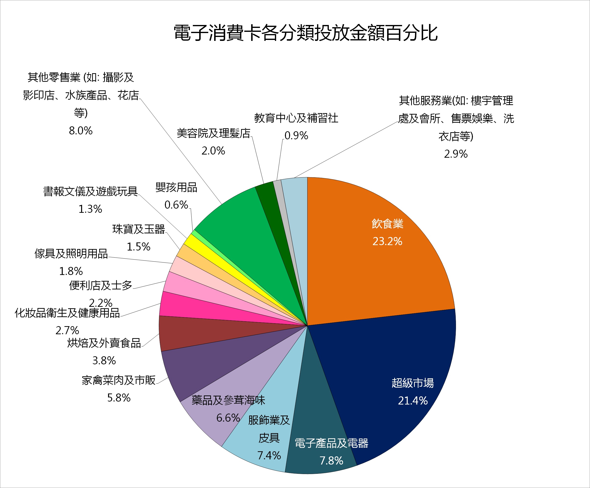 零售行業方面,超級市場為零售業中交易額佔比最高的版塊,佔零售業的30.1%,同時亦佔全部總交易額的21.4%,而電子產品及電器、服飾及皮具、藥品及參茸海味、家禽菜肉及市販等商戶的消費額,分別佔總體消費卡交易額的7.8%、7.4%、6.6%及5.8%。