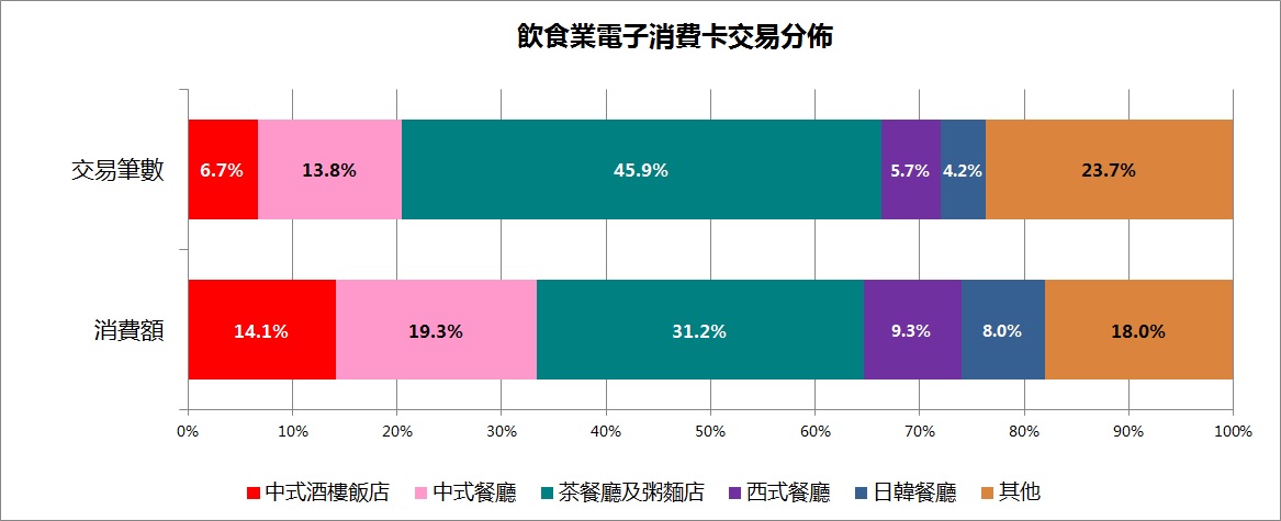 飲食業的消費額在各分類中佔比最高,約佔消費卡使用總額的23.2%,當中用於“茶餐廳及粥麵店"的交易筆數及消費額均位居首位,分別佔飲食業的45.9%及31.2%。曾使用消費卡的人當中,有46.1%曾於“茶餐廳及粥麵店"消費。
