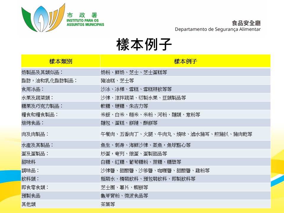 為保障消費者的食用安全,市政署依據目前流通市場的食品種類和特點,制定各類型的食品調查抽樣計劃,包括“常規食品調查”及“食肆食品調查”計劃。抽樣調查的範圍包括本澳各區之超級市場、雜貨店、百貨公司、飲食場所、外賣店等,並抽取各類即食食品、飲品、糧油食品、零食等。本年第一季合共抽取六百七十三個樣本進行化學、微生物學及輻射水平等檢驗,整體合格率99.6%。