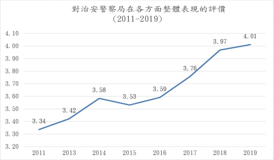 其中,治安警察局七個服務範疇包括「與出入境驗證有關的服務」、「與申請居留、留澳工作及留學有關的服務」、「與警務工作有關的服務」、「與交通管理有關的服務」、「各項緊急求助或舉報熱線服務」、「各項與殯儀業、保安業及武器彈藥有關的申請」、「其他由治安警察局提供的服務」的滿意度比例超過八成七,顯示市民對治安警各方面服務甚為滿意,平均得分為4.15分(最高為5分),對比歷年滿意度,呈穩步上揚趨勢,而是次也是自2011年調查以來得分最高。歡迎市民登入治安警察局網站參閱《治安警察局市民整體滿意度調查概況2019》(http://www.fsm.gov.mo/psp/cht/pdf/left_1/Satisf_2019_C.pdf)。