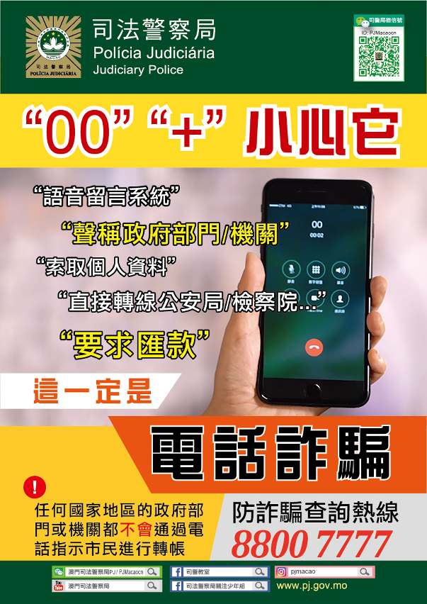 如有疑問,請致電司法警察局防詐騙查詢熱線(853)8800 7777或(853)2855 7777求助或舉報。