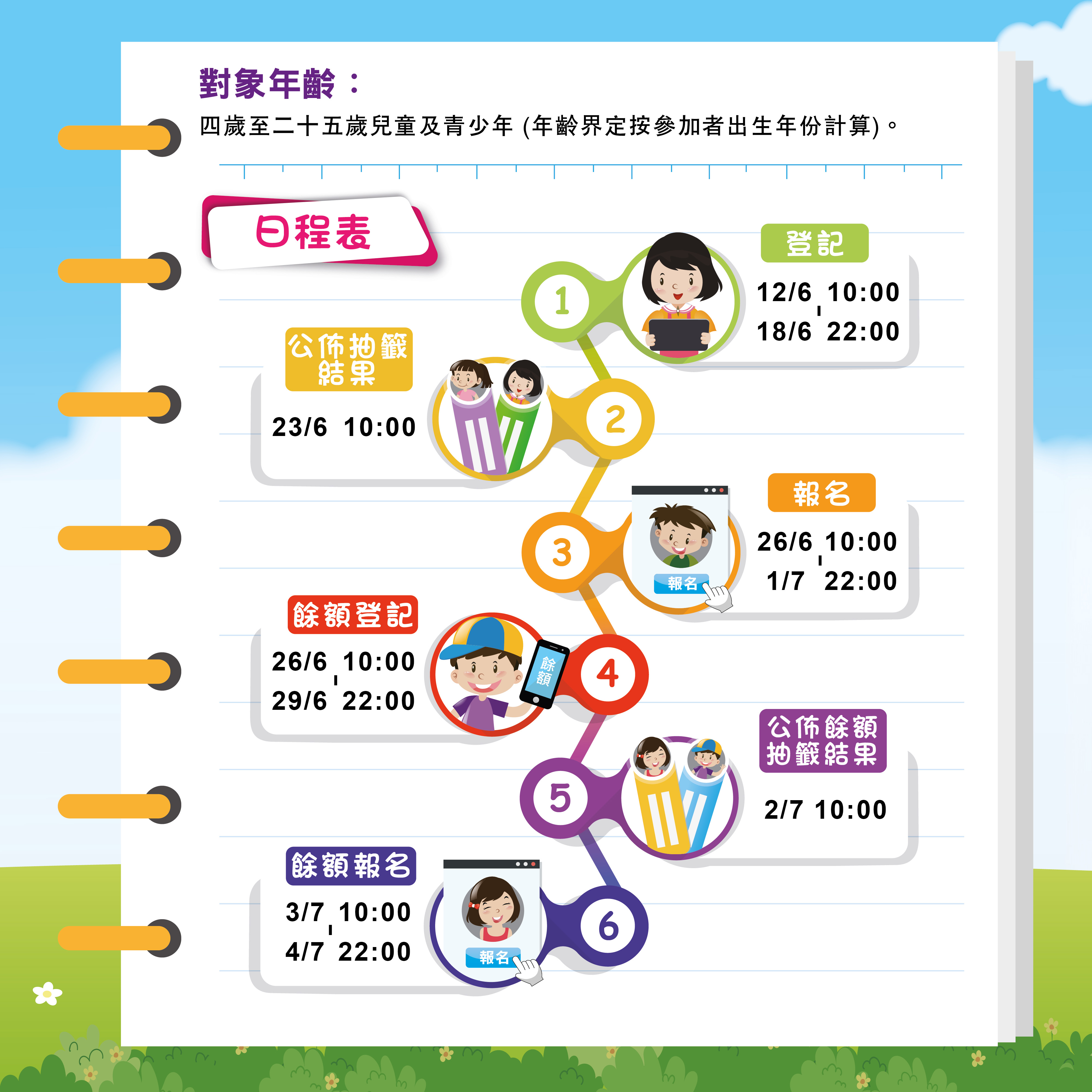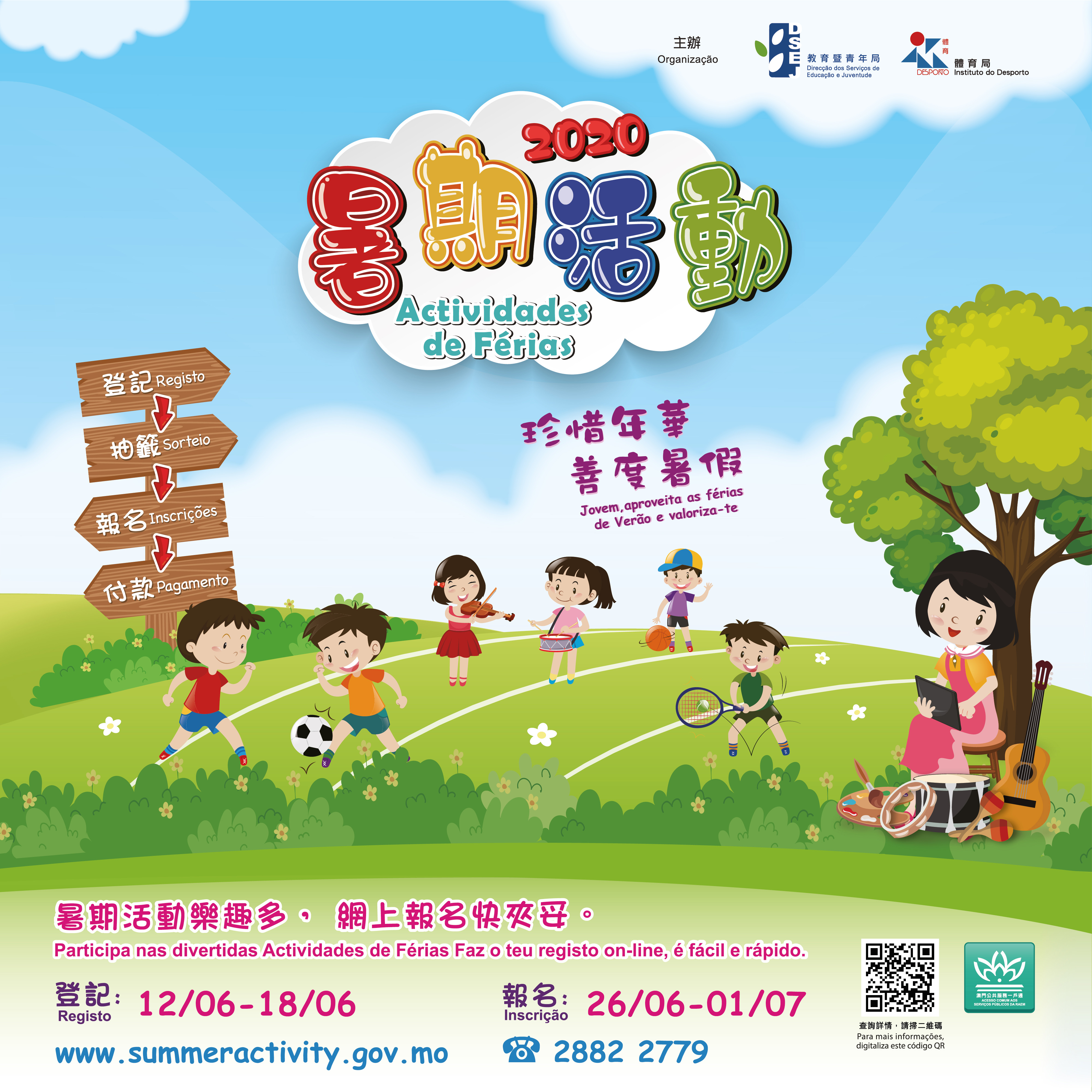 教育暨青年局與體育局主辦的2020暑期活動全面網上報名,登記日期爲6月12日上午10時至6月18日晚上10時,參加者可登入暑期活動網頁www.summeractivity.gov.mo進行登記。成功登記者須於6月23日公布抽籤結果後,按中籤時間完成網上報名,並以電子支付方式繳費。報名採用先到先得形式進行。