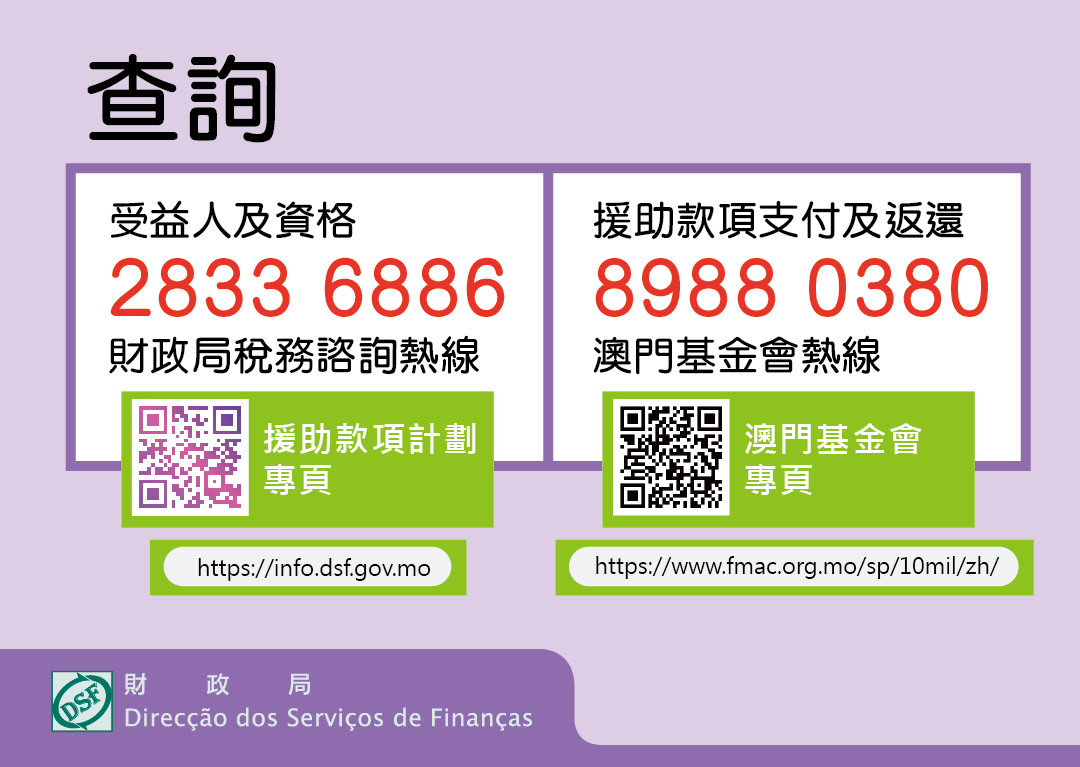 受益人及商號如對資料及資格有進一步查詢,歡迎致電財政局稅務諮詢熱線 (2833 6886)。如涉及援助款項支付及返還的查詢,歡迎致電澳門基金會熱線(8988 0380)。