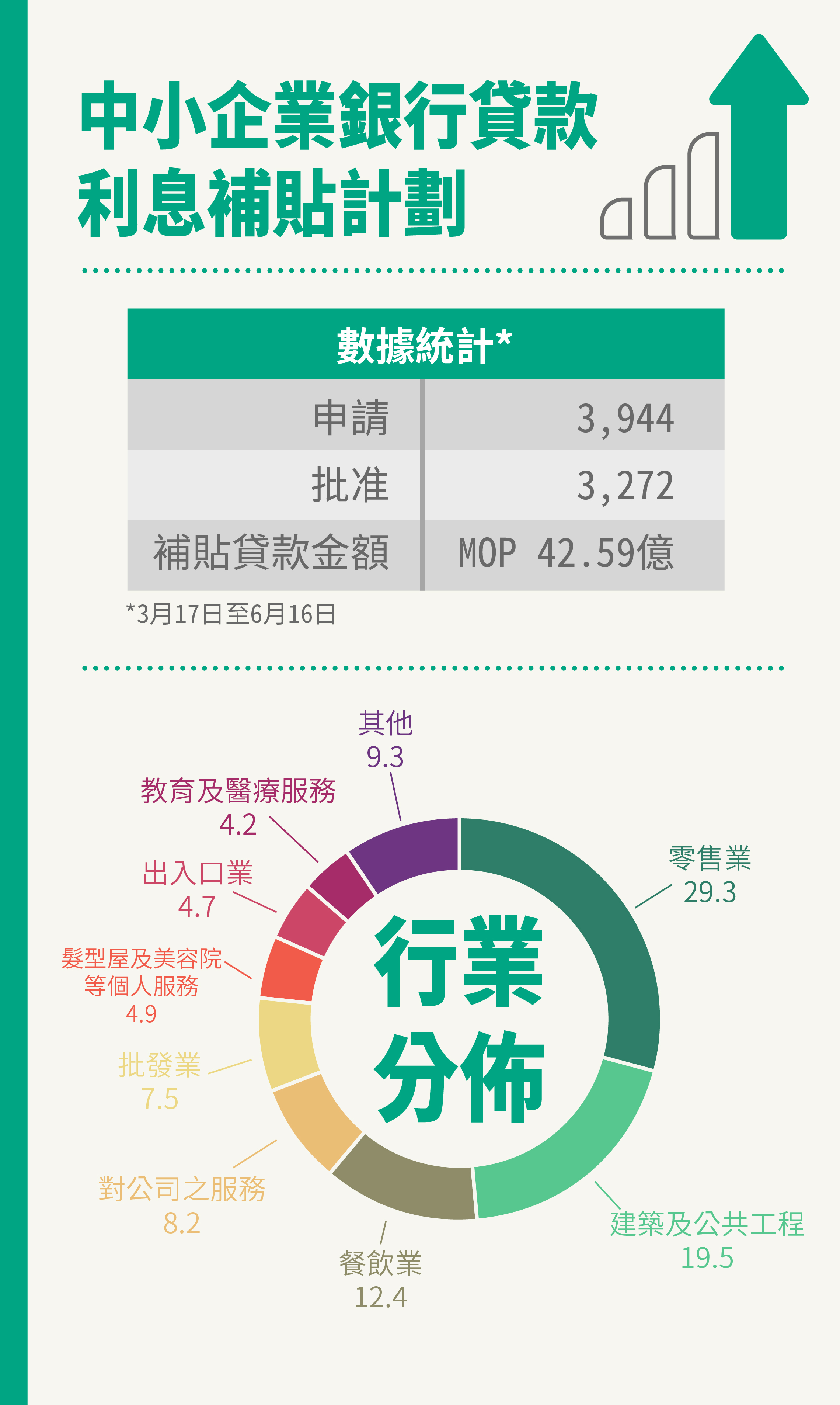 計劃推出至今已三個月,獲批准的3,272宗申請個案中,受惠行業主要包括:零售業(29.3%)、建築及公共工程(19.5%)、餐飲業(12.4%)、對公司之服務(8.2%)、批發業(7.5%)、髮型屋及美容院等個人服務(4.9%)、出入口業(4.7%)、教育及醫療機構(4.2%)。不批准的個案有17宗,主要由於企業未具備適當的行業准照,或不符合申請資格要求。