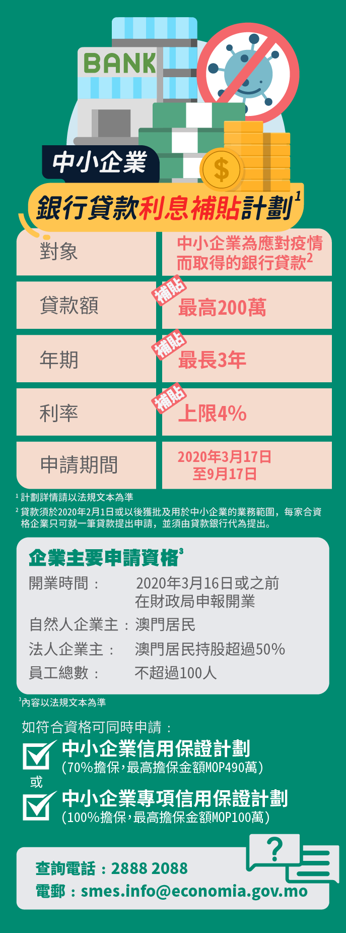 根據相關行政法規規定,符合資格的澳門中小企業,如獲得銀行貸放一筆用於應對新型冠狀病毒肺炎的款項,可就該筆貸款申請利息補貼。可獲補貼的貸款上限為200萬澳門元,補貼率上限為四厘,利息補貼期最長為三年。補貼貸款總金額上限為100億澳門元。