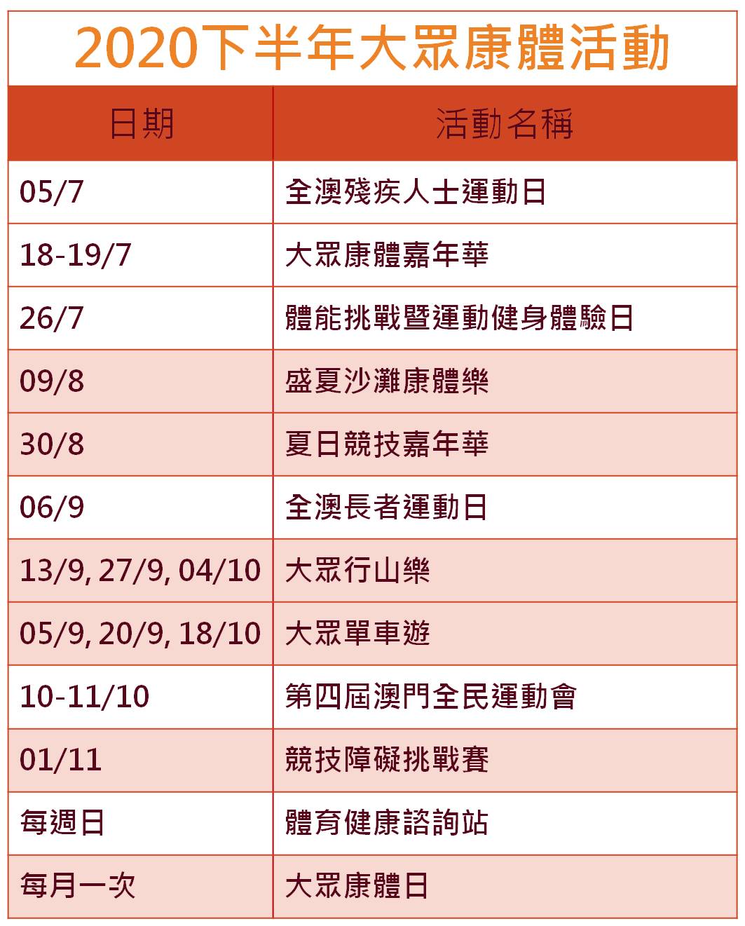 為了推廣全民運動健體的健康生活模式,體育局在本年下半年將繼續舉辦多元化的大眾體育活動供全澳市民參與,滿足不同年齡、性別及階層的市民的運動需求,豐富大眾的餘暇生活,培養恆常鍛鍊生活習慣,增強身體抵抗力。