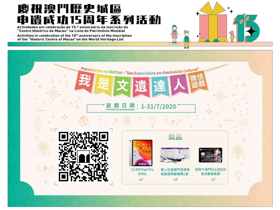 為慶祝澳門歷史城區申遺成功15周年,文化局推出“我是文遺達人”微信有獎遊戲,冀提高社會大眾對《文化遺產保護法》的瞭解,以及增加對文化遺產的關注和保護意識,遊戲獎品豐富,歡迎市民踴躍參與。
