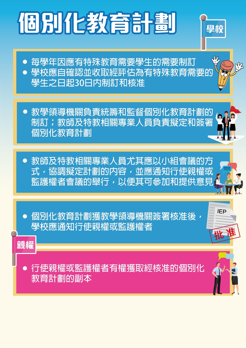 訂定特殊教育應遵守的基本原則,以及評估有特教需要學生的準則,包括須用多元評量原則,使用標準化評量工具,以及考慮學生的成長背景及學習經驗等。