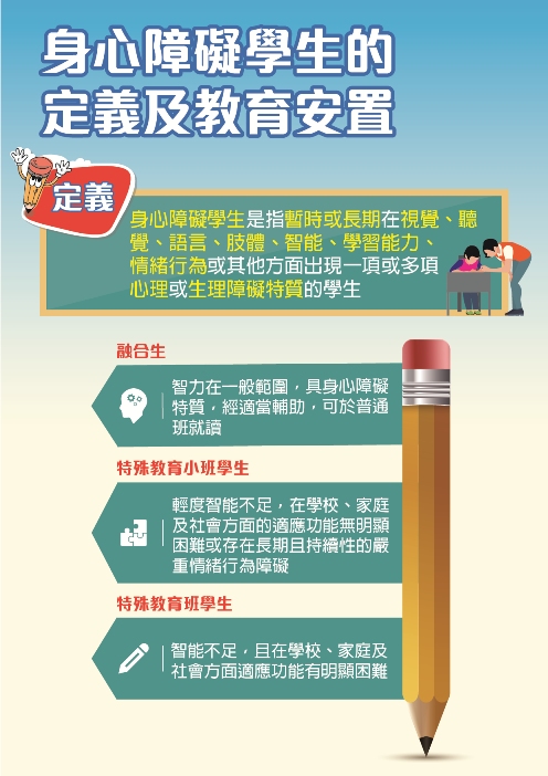 對於有身心障礙的學生,法規區分了融合生、特殊教育小班學生和特殊教育班學生共三個類別。融合生在普通班就讀;特殊教育小班可於普通學校或特殊教育學校各教育階段開設;特殊教育班按年齡劃分為幼兒、小學、初中及高中教育階段。融合生的課程目標與正規教育基本相同;特殊教育小班學生的課程旨在使學生擁有從事某一職業所需的基本知識、能力及態度;特殊教育班學生的課程則旨在培養學生的獨立生活能力、基本職業技能及態度。