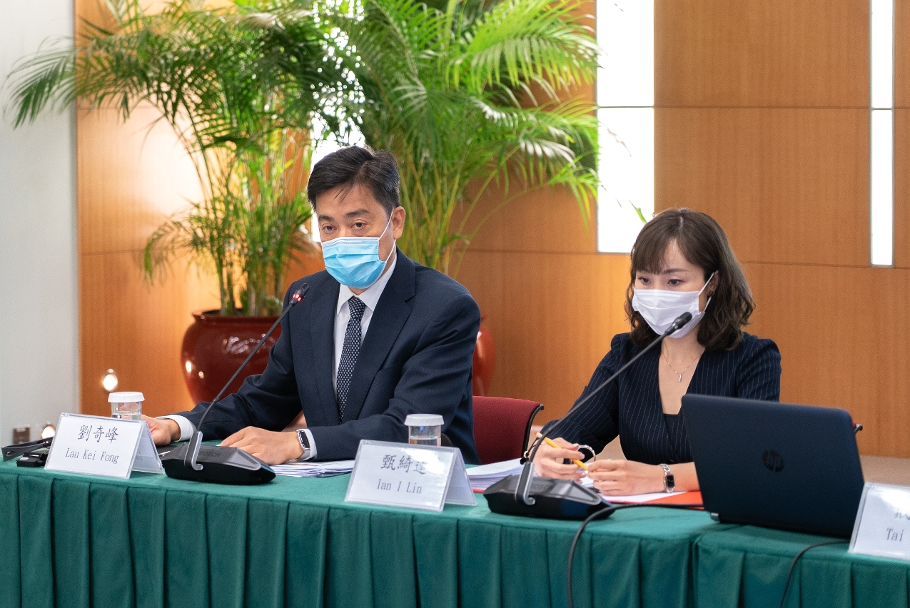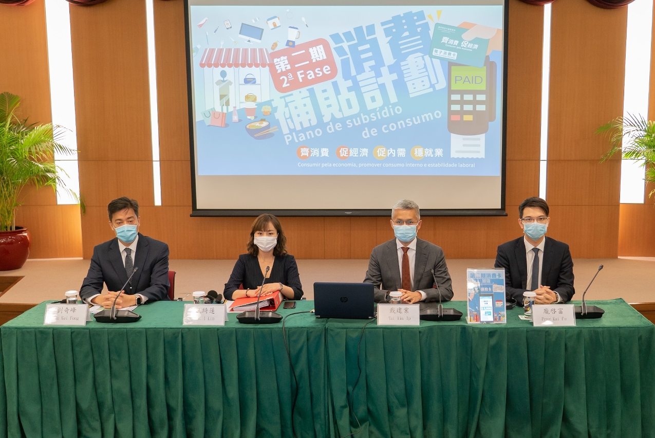 經濟局、澳門金融管理局今(23)日舉行聯合新聞發佈會,公佈《第二期消費補貼計劃》的詳情,經濟局局長戴建業、經濟財政司司長辦公室顧問甄綺蓮、澳門金融管理局金融基建及資訊廳總監劉奇峰以及經濟局研究廳廳長龐啓富出席。