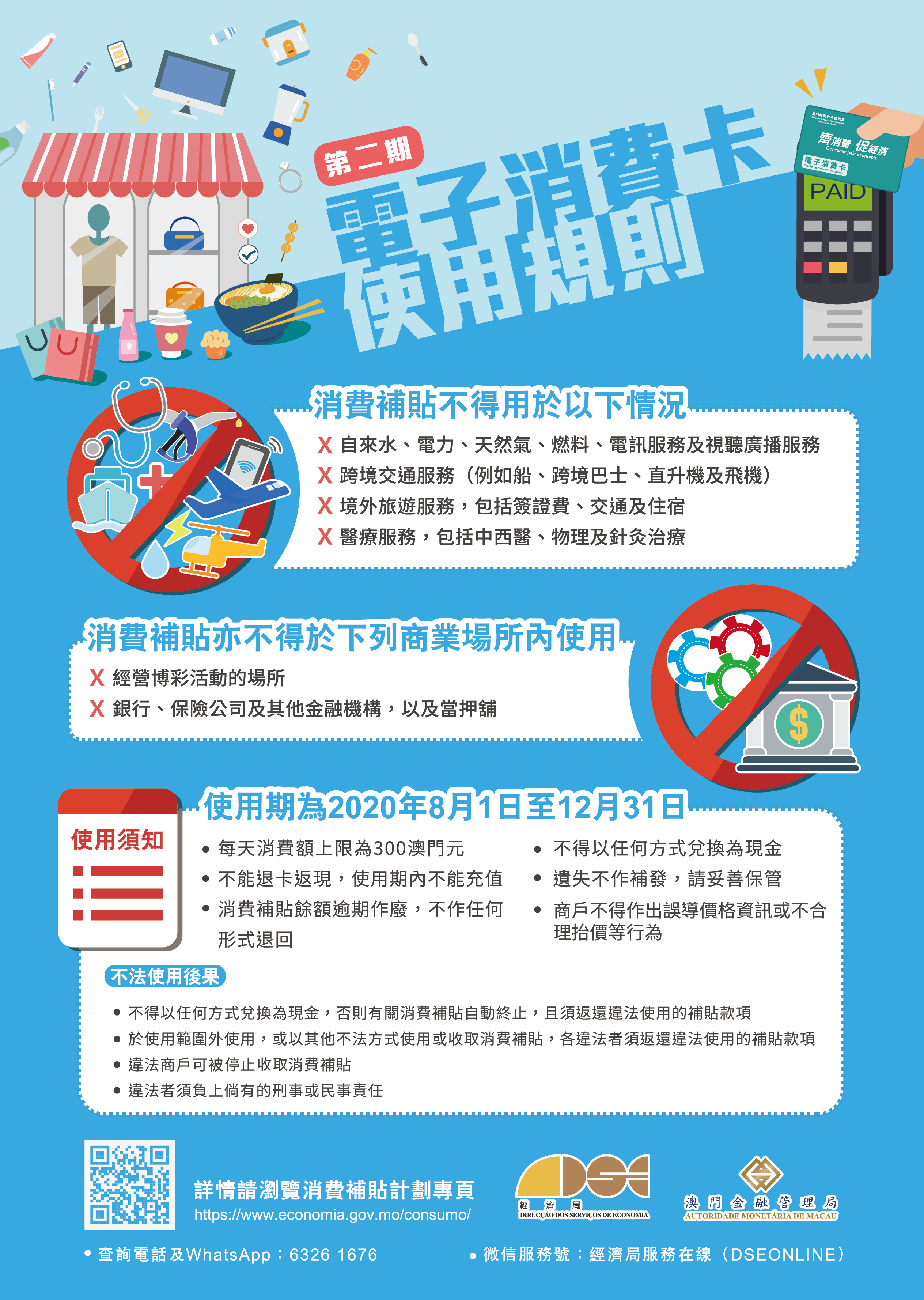 根據第25/2020號行政法規《第二期消費補貼計劃》的規定,收取電子消費卡的商戶不得以不法方式收取消費補貼,亦不得作出誤導價格資訊或不合理抬價等損害消費者權益的行為,且須履行充分合作的義務。倘若商戶違反有關使用規定,可被停止收取消費補貼。經濟局提醒各商戶必須遵守相關法規的規定並做好管理工作,亦不得把消費卡的手續費轉嫁予消費者,如發現違規情況,特區政府將嚴肅處理。