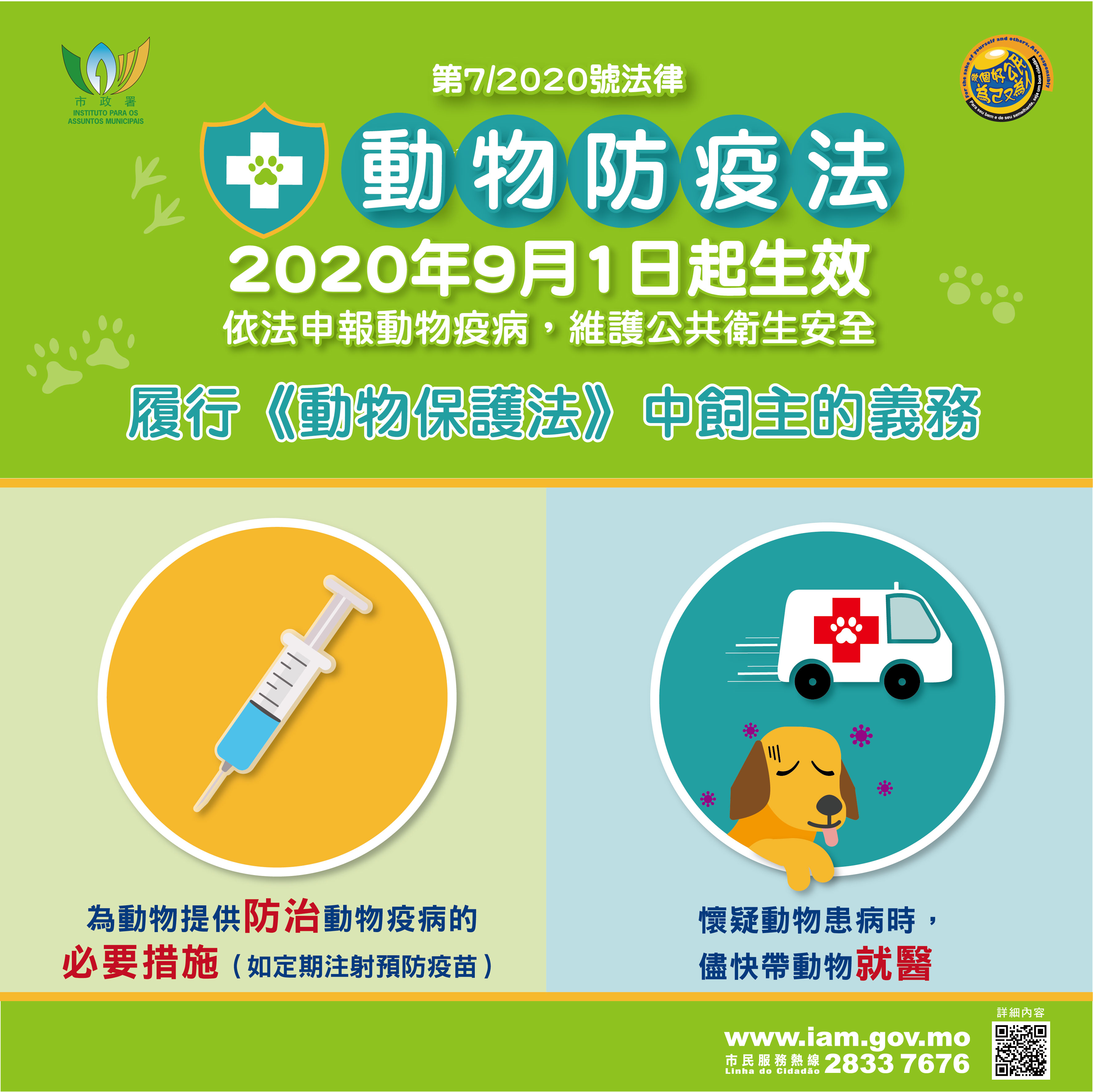配合《動物保護法》的全面實施,提高本澳動物衛生水平,澳門特區政府制訂了第7/2020號法律《動物防疫法》,對預防及應對動物疫病傳播風險的管制措施作出法律規範,法律將於本年九月一日生效。
