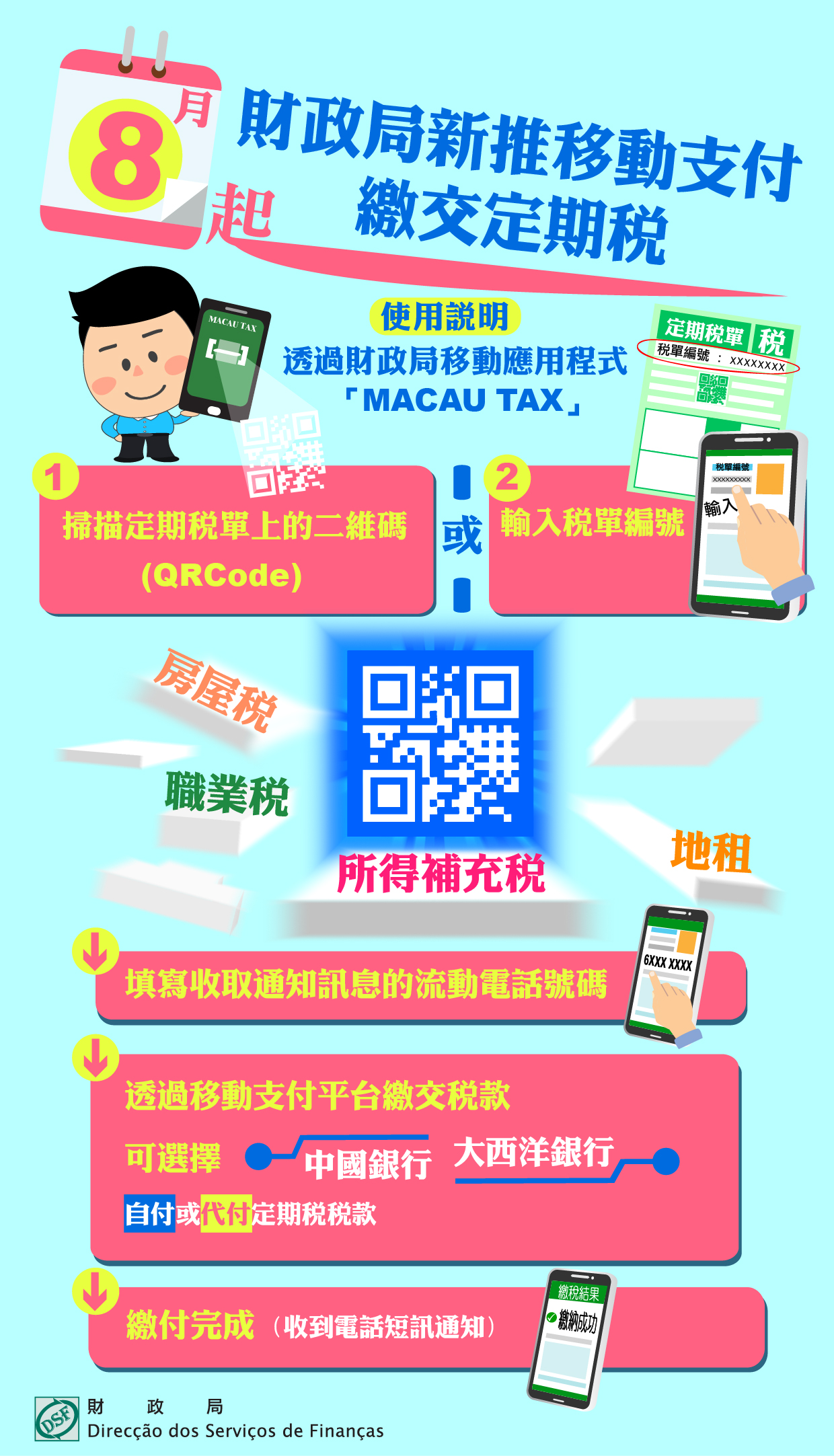 為便利市民繳納稅款,除現行繳稅方式外,財政局8月起新推移動支付平台繳納定期稅稅款,稅種包括:所得補充稅、房屋稅、職業稅、地租。市民可透過財政局移動應用程式「MACAU TAX」掃描定期稅單上的二維碼(QRCode),又或輸入稅單編號,並填寫收取通知訊息的流動電話號碼,即可以中國銀行、大西洋銀行的移動支付平台自付或代付相關定期稅稅款,繳付完成後,將收到成功繳納的電話短訊,簡單方便容易操作。