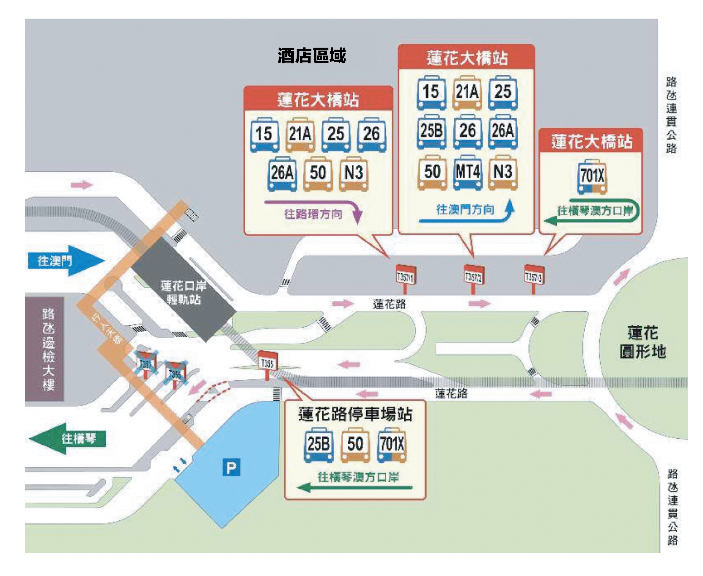 為方便市民和旅客往來橫琴新口岸,交通事務局將於 8 月 18 日下午2時30分開始,啟用三個新巴士站,並安排現有25B及50路線巴士由同日下午2時45分起延伸服務至橫琴口岸澳門口岸區;下午2時50分起,新增二十四小時運行的接駁巴士線701X,將往返橫琴澳方口岸站至蓮花大橋站及蓮花路停車場站(見圖3)。橫琴新口岸澳門口岸區亦設有的士站,乘客在此的士站上車須繳付每程澳門元5元之附加費。