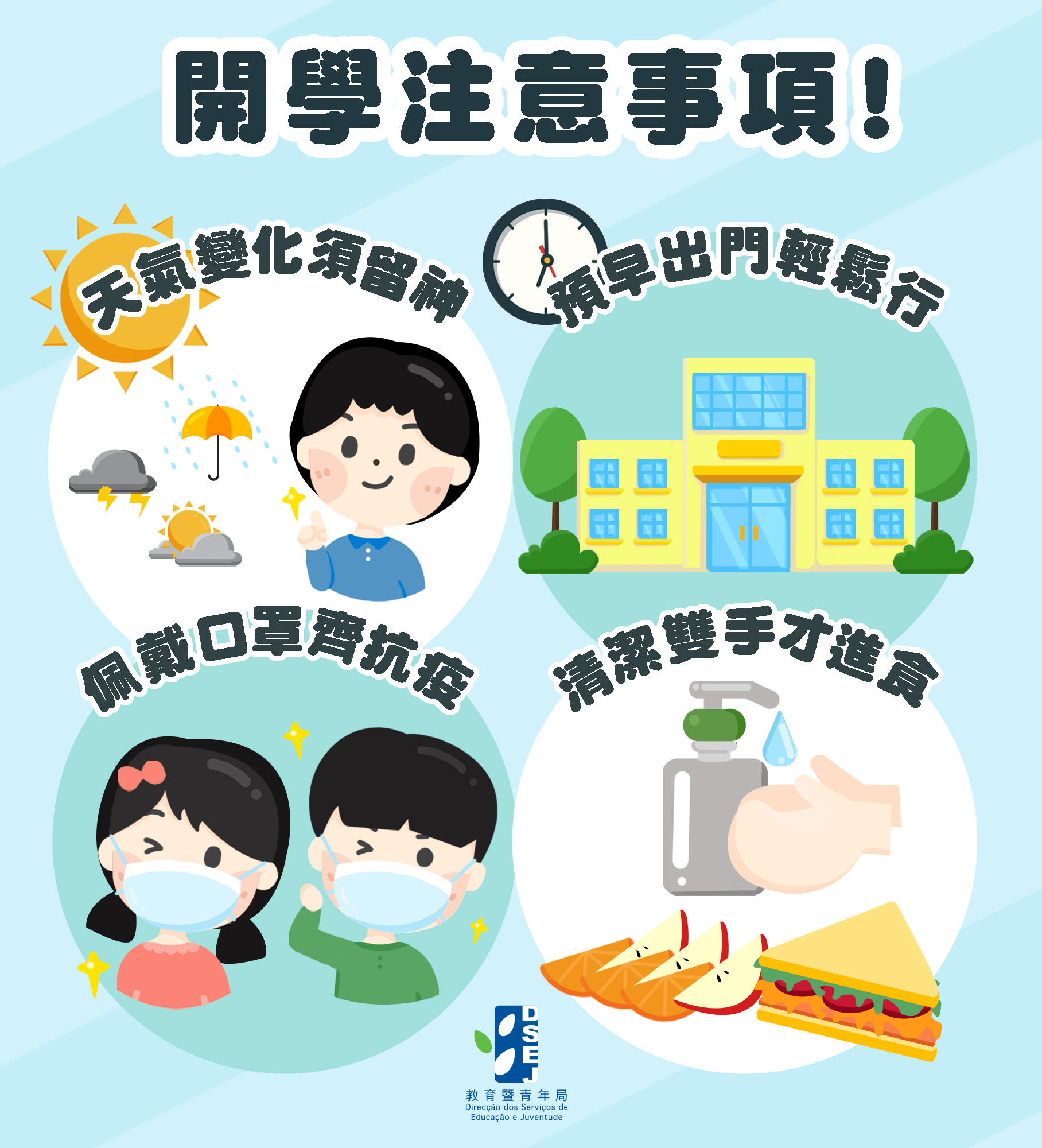 新學年即將到來,本澳幼兒、小學、中學及特殊教育學校將於9月初陸續開學,並會實施錯峰上學安排。教育暨青年局呼籲家長關注特區政府的防疫措施,並密切留意交通和天氣的情況,以及子女的身體狀況,教導子女防疫知識及保持良好衛生習慣的重要;跨境學生更須在開學前留意出入境政策,並適時完成核酸檢測,為開學做好準備。為確保新學年順利開學,教青局會派員於學校開課首日到校實地瞭解情況。