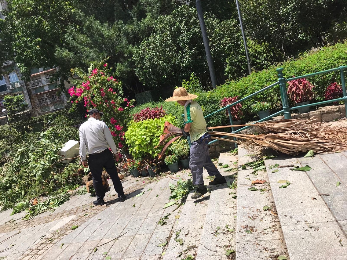 颱風過後,市政署持續加緊清理各區塌樹及斷枝,已優先處理影響行車路面或緊急的個案,移除被吹倒的樹木以及斷枝樹葉,以保障市民安全。至目前經已處理了超過一千株因颱風吹襲而受損的樹木,有關清理及樹木扶正等工作仍在加緊進行。另外,市政署管轄之綠化及休憩設施須關閉進行巡查及評估安全,當中有部分設施已逐步開放。