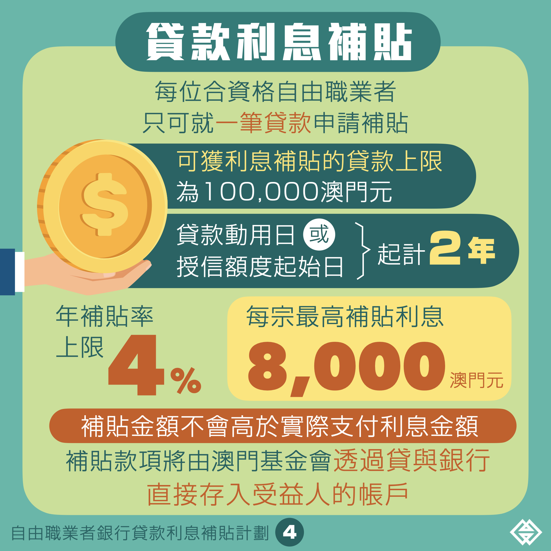 行政法規訂定,未有拖欠特區政府債務的澳門居民,於2020年2月1日至12月31日期間向澳門銀行申請並獲批的貸款,且貸款非用於購買不動產或金融投資產品,可透過貸與銀行向澳門金融管理局申請利息補貼。申請者必須於申請時,為已登記職業稅第二組納稅人,或持有交通事務局所發出的士駕駛員證且經核實從事的士客運業務,但的士車主除外;申請者只可就一筆貸款申請利息補貼,可獲利息補貼的貸款金額上限為10萬澳門元,補貼期由貸款動用日或授信額度起計最長兩年,利息補貼率上限為四個百分點,補貼金額不可超過申請者實際支付的利息金額,每宗最高補貼8,000澳門元。獲許可的補貼款項,將由澳門基金會透過貸與銀行直接存入受益人的帳戶。初步預計合資格的申請人士約有15,000人。