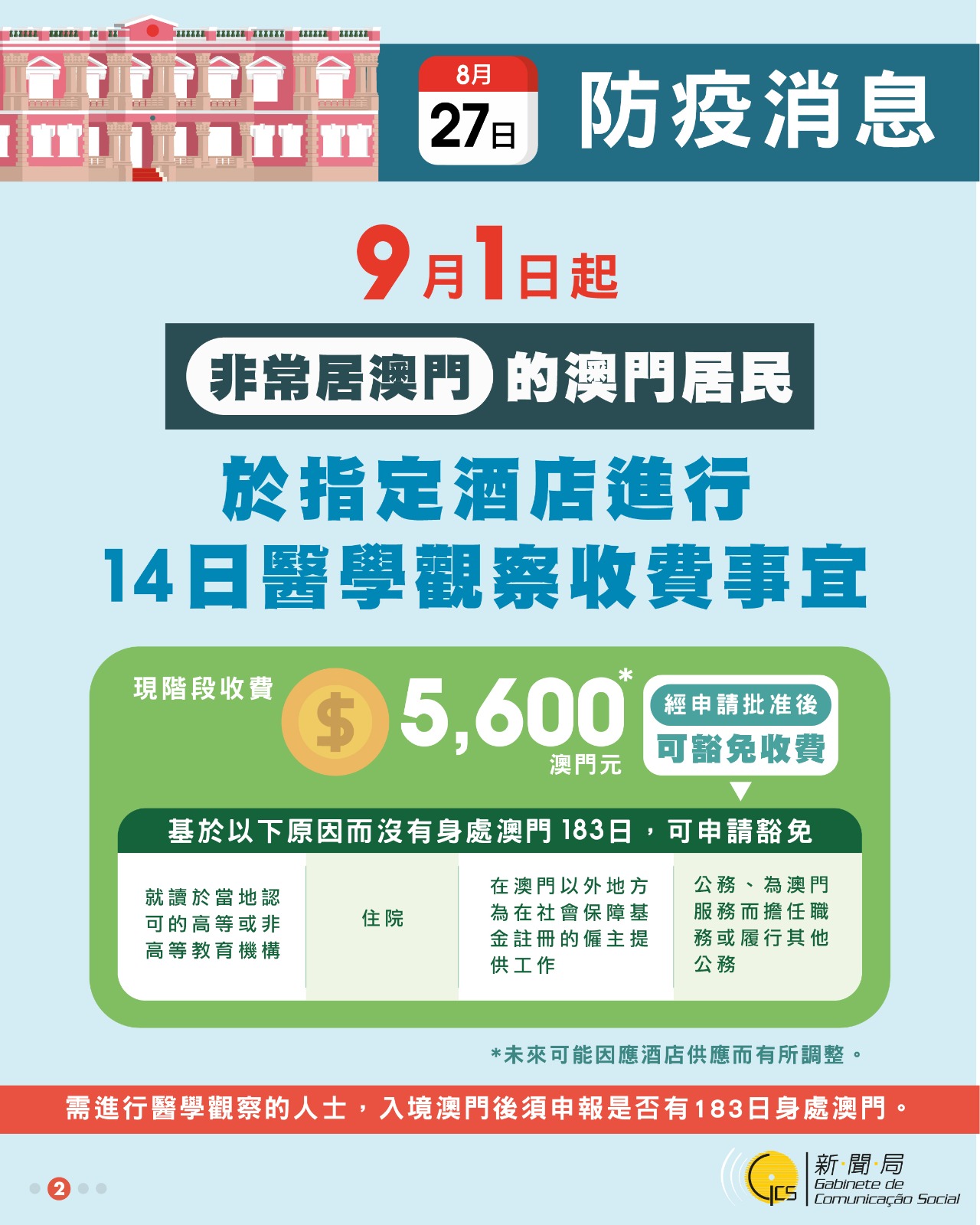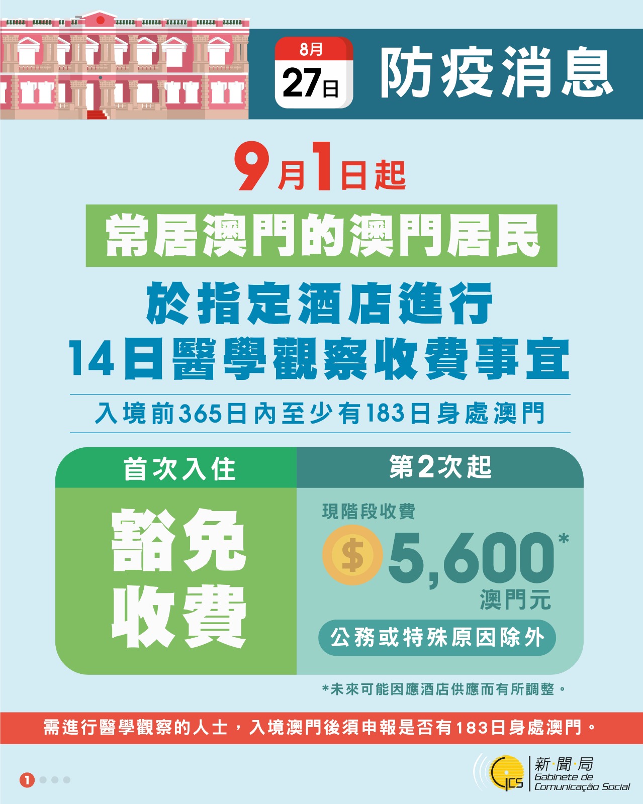 9月1日起於指定酒店進行醫學觀察的收費安排