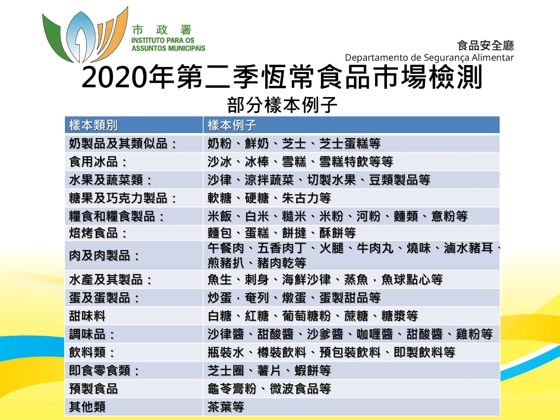 為保障消費者的食用安全,巿政署食品安全廳依據目前流通市場的食品種類和特點,制定各類型的食品調查抽樣計劃,包括“常規食品調查”及“食肆食品調查”計劃,進行化學、微生物學及輻射水準等檢驗。抽樣調查的範圍包括本澳各區之超級市場、雜貨店、百貨公司、飲食場所及外賣店等,抽取各類即食食品、飲品、糧油食品、零食等。本年第2季合共抽取695個樣本,所有樣本的檢測結果均未見異常。
