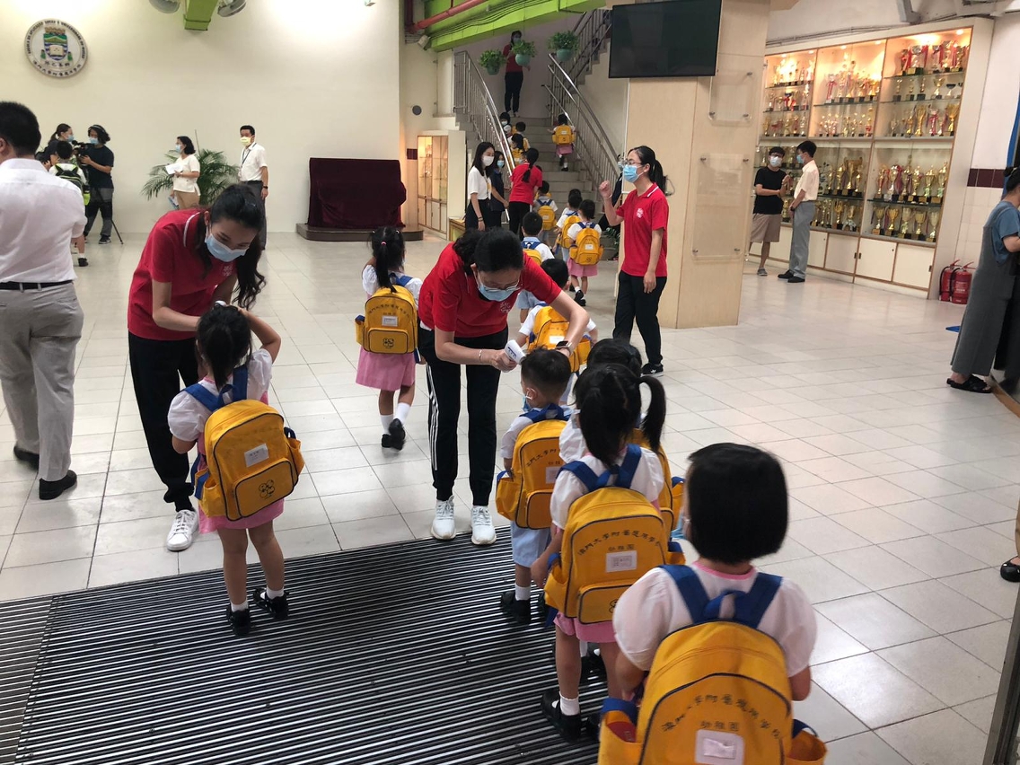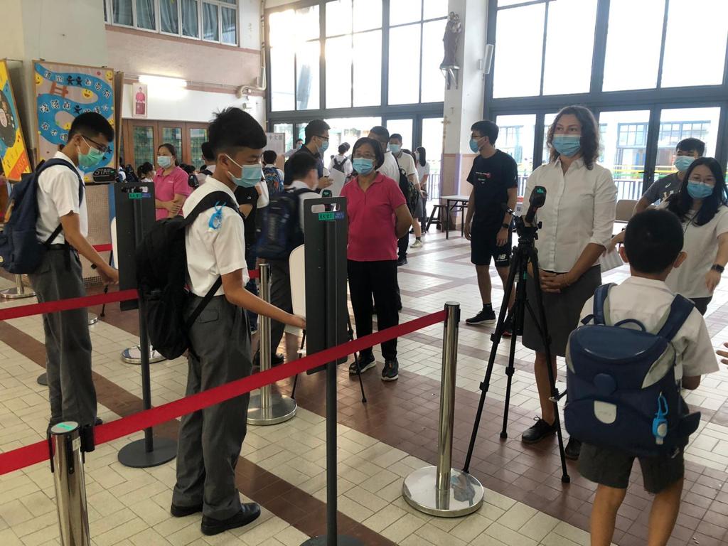 教青局領導、主管及人員於9月1日早上到學校實地瞭解學生上學及學校開學的情況,並向教職員工在疫情期間的辛勞付出和對特區政府各項防疫措施的積極配合表達謝意。有學生表示為較好掌握時間,選擇了步行上學或提早乘坐巴士,而學校亦安排教職員為進入校園的師生檢測體溫、檢查個人健康聲明、提醒師生用搓手液清潔雙手,進入校園後,亦要按序及保持距離進入課室,過程順暢。