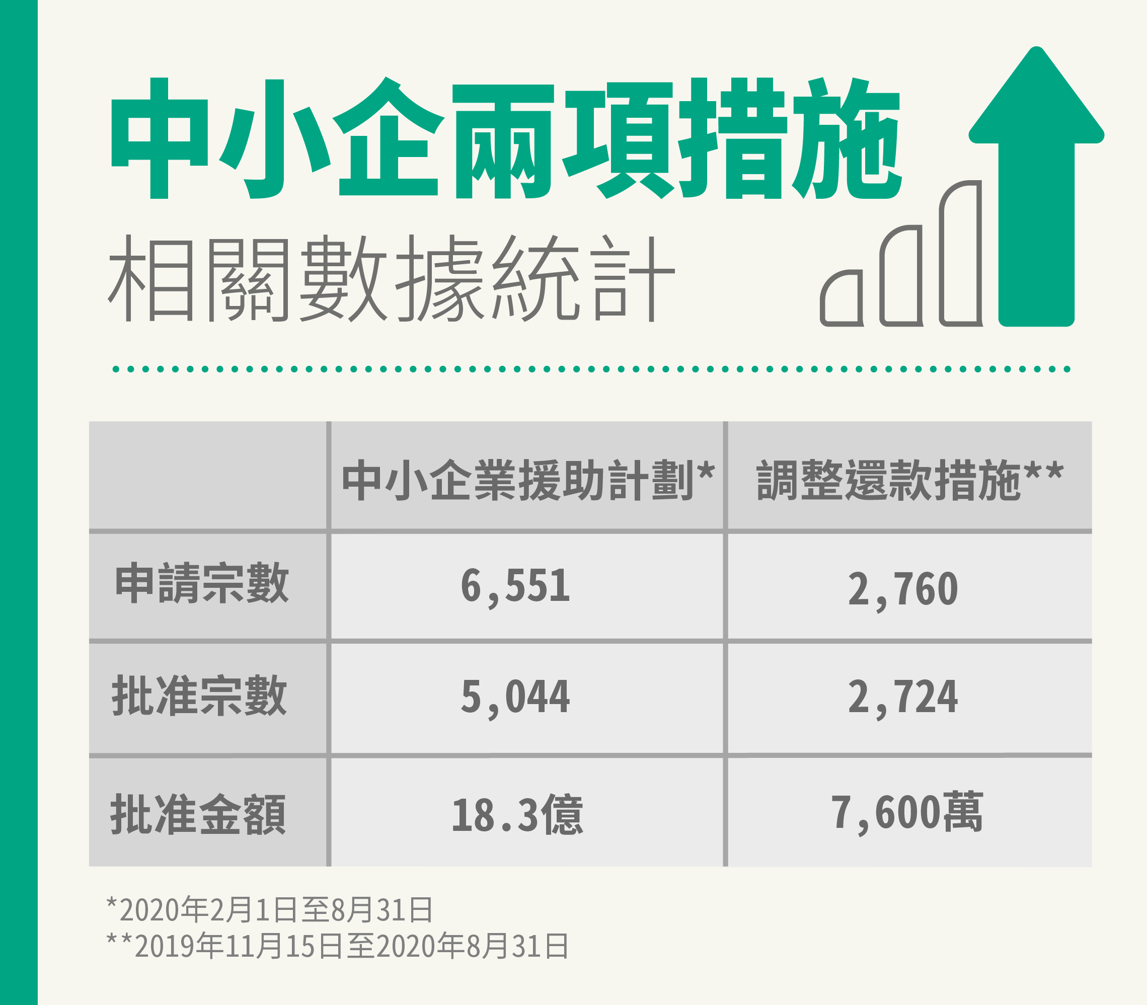 為擴大支援受新冠肺炎疫情影響的中小企,特區政府臨時放寬“中小企業援助計劃”的申請條件,營業滿一年且符合其他資格的中小企業,可因應疫情影響而提出申請。截至8月底,共有779宗申請受惠於臨時放寬措施。