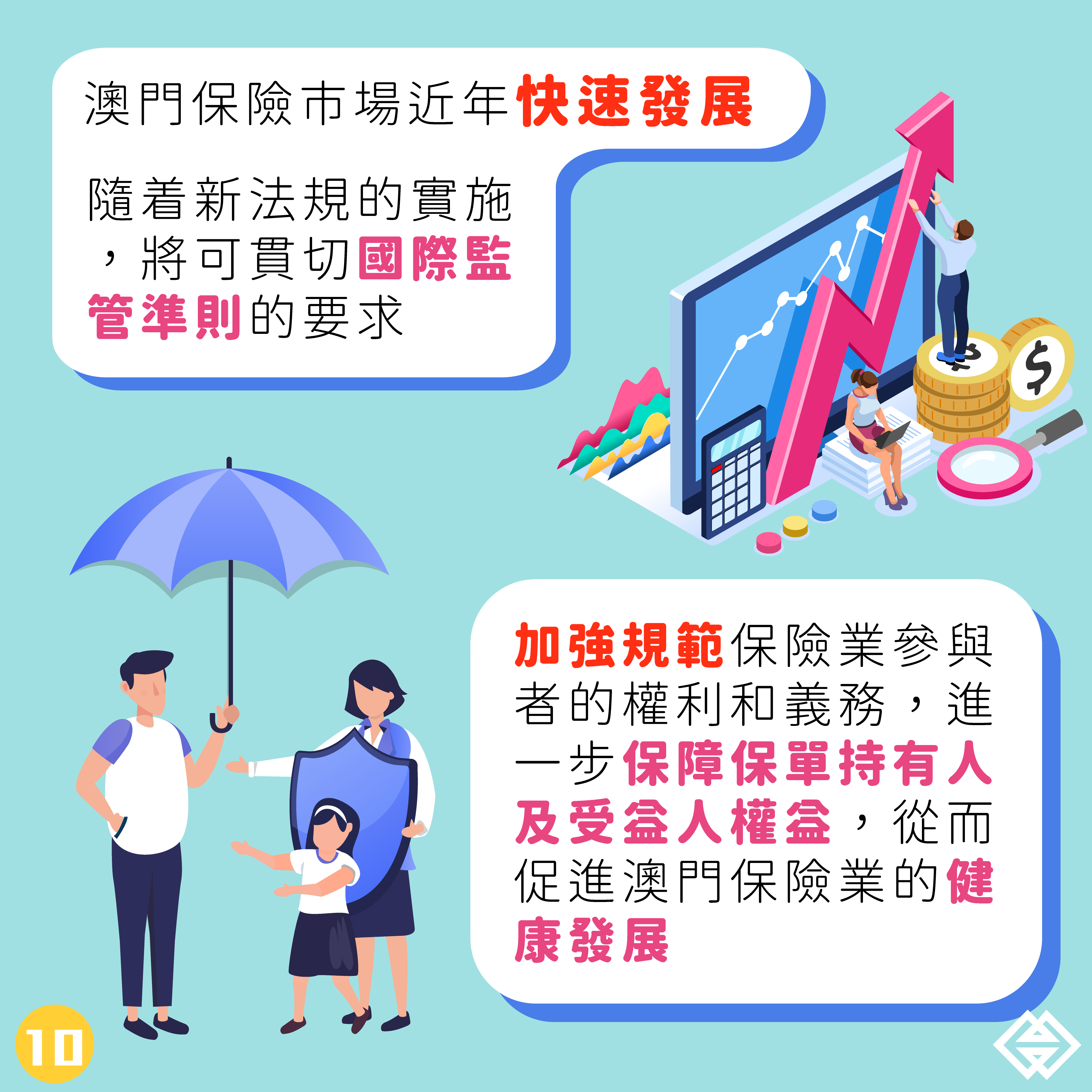 基於近年澳門保險市場快速發展,金管局相信隨着新法規的實施,將可貫切國際監管準則的要求,尤其是加強規範保險業參與者的權利和義務,進一步保障保單持有人及受益人權益,從而促進澳門保險業的健康發展。有關《保險業務法律制度》的詳細內容可瀏覽金管局網頁(https://www.amcm.gov.mo/zh/insurance-sector/rules-and-guidelines)。