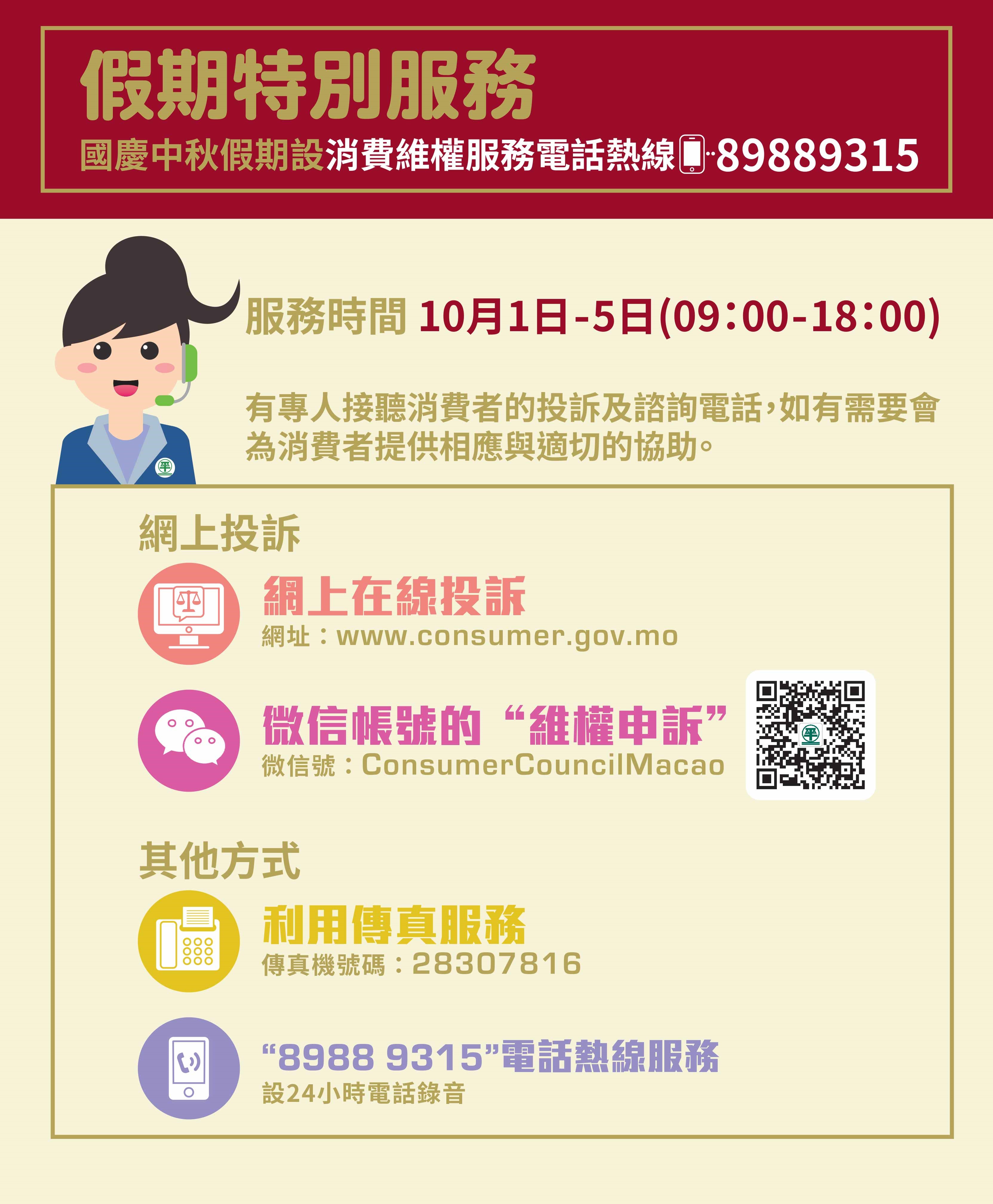 消費者委員會在國慶及中秋假期設電話服務熱線(電話:89889315),服務時間由10月1日至5日,上午9時至下午6時派員接聽消費者的投訴及諮詢電話,並在有需要情況下為消費者提供相應與適切的協助。