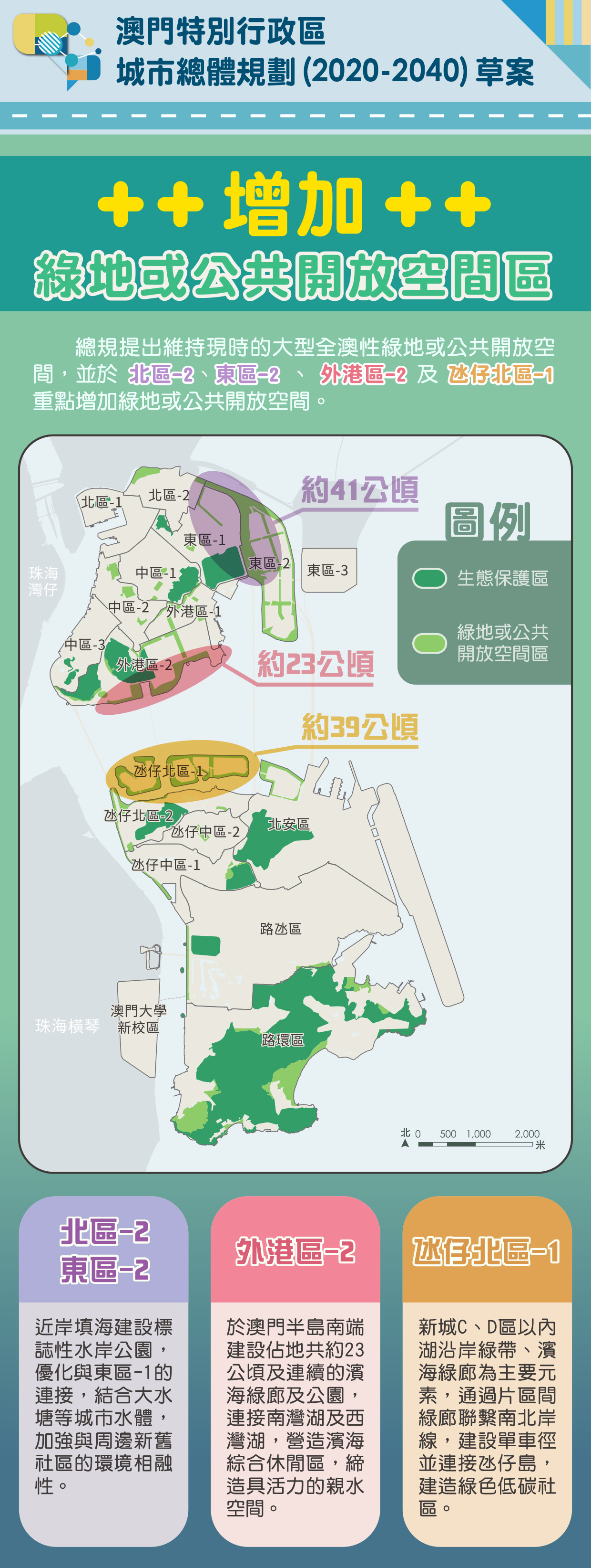 總規草案提出維持現時的大型全澳性綠地或公共開放空間,並於北區-2、東區-2、外港區-2及氹仔北區-1重點增加綠地或公共開放空間。