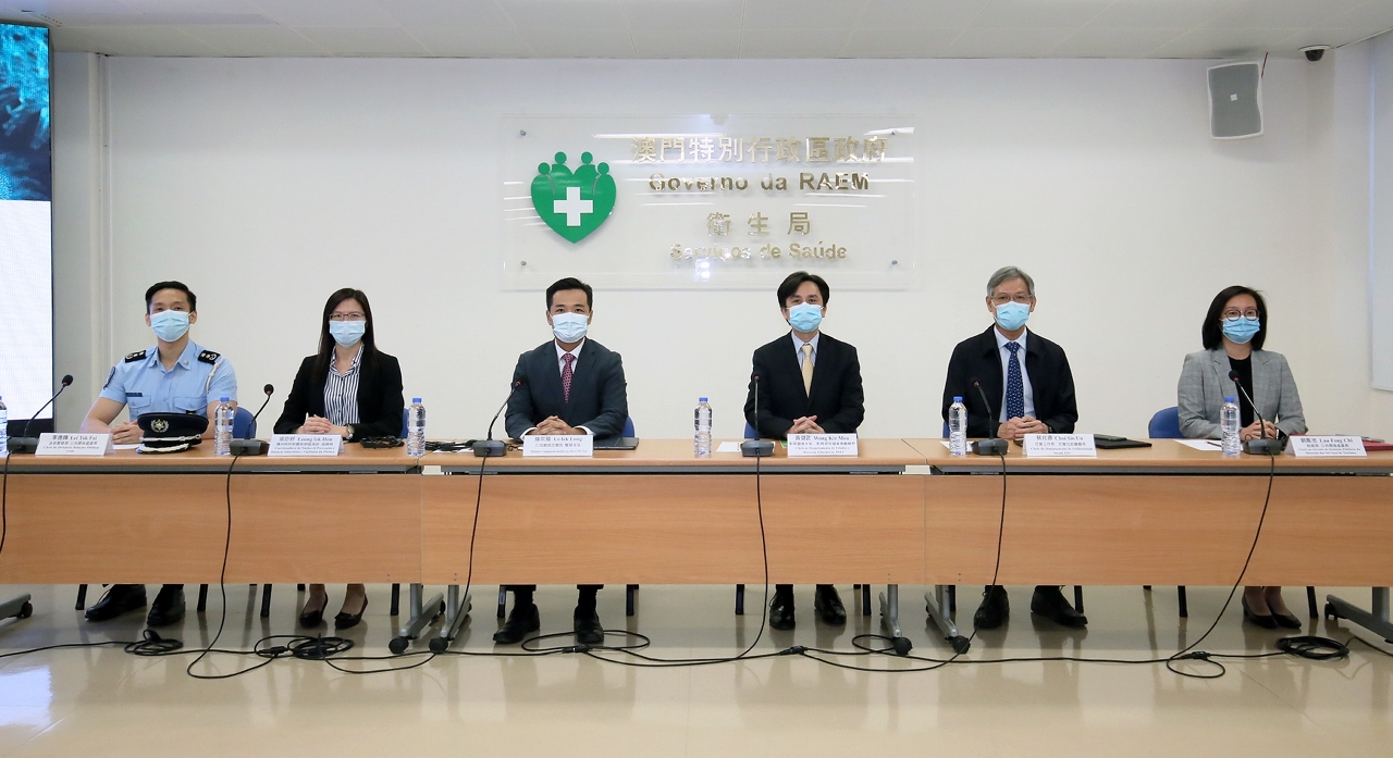 新型冠狀病毒感染應變協調中心(下稱應變協調中心)於今(19)日舉行例行記者會,仁伯爵綜合醫院羅奕龍醫務主任、教育暨青年局教育研究暨資源廳黃健武廳長、社會工作局社會互助廳蔡兆源廳長、治安警察局公共關係處李德輝處長、旅遊局公共關係處劉鳳池處長、疾病預防控制中心傳染病防制暨疾病監測部梁亦好協調員共同會見傳媒。
