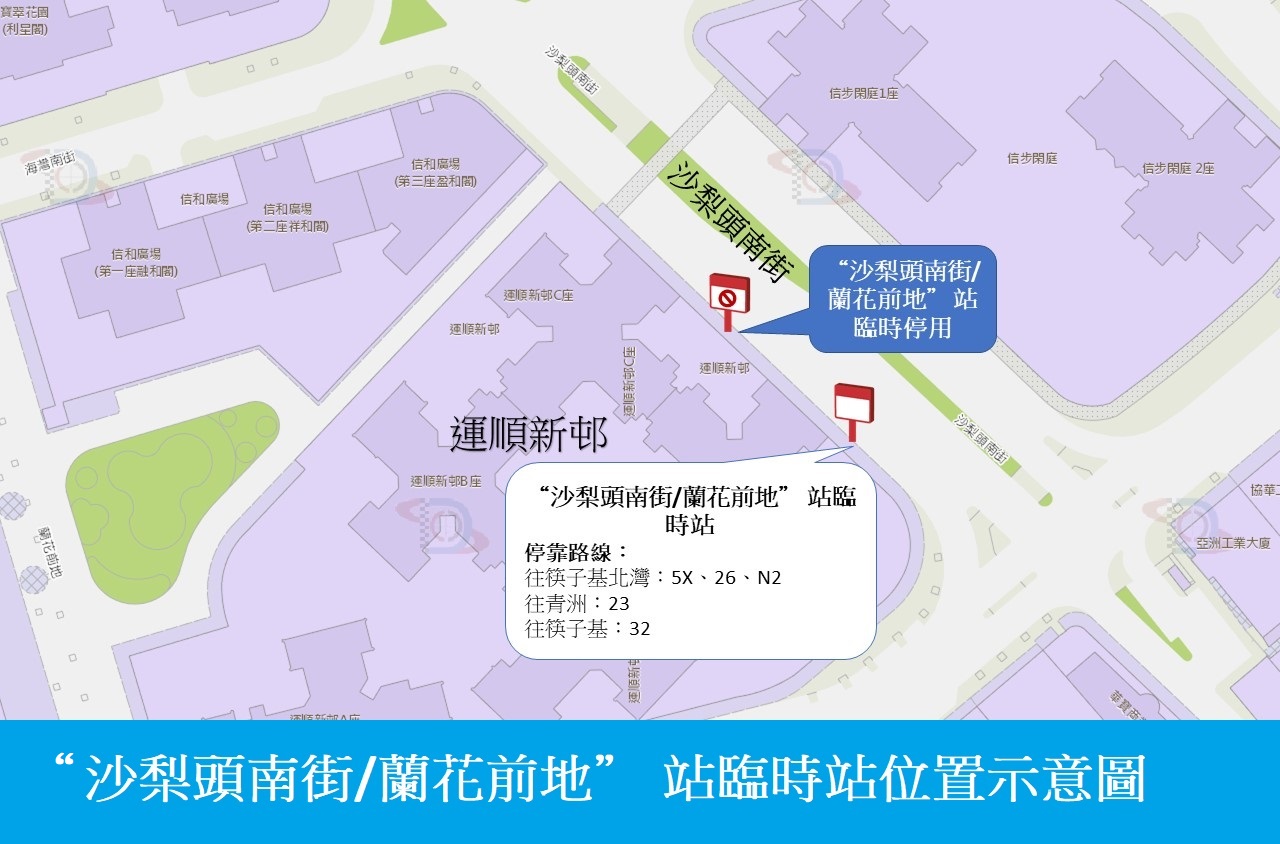 因應市政署重鋪路面所需,10月23日(周五)至11月5日(周四)沙梨頭南街實施臨時交通安排,其中,10月24日(周六)上午10時起至10月31日(周六)“沙梨頭南街/蘭花前地”站臨時停用,乘客可使用設於沙梨頭南街距原站約30米之臨時站,詳情請見下表。市政署及交通事務局呼籲駕駛者留意有關安排。