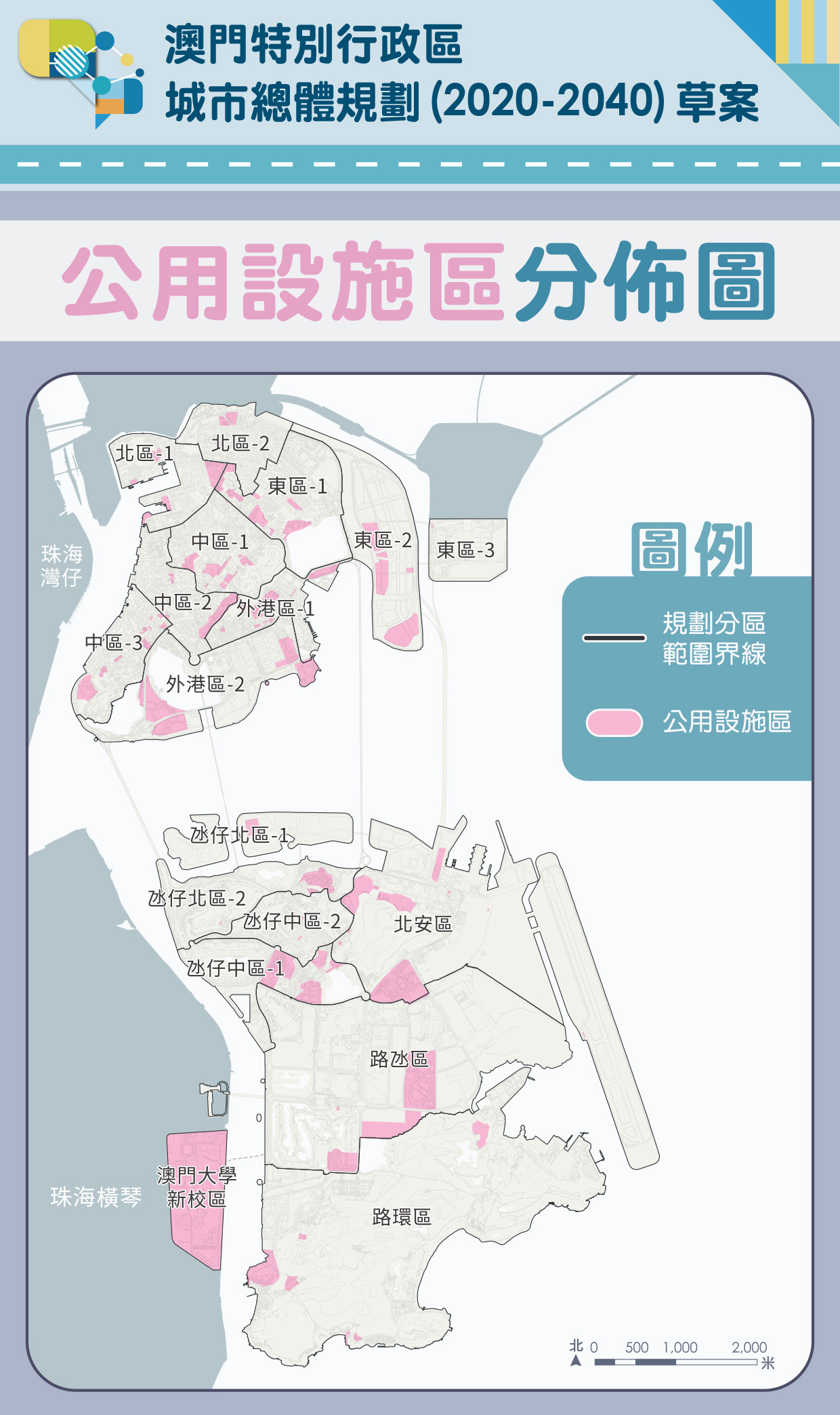 為此,《澳門特別行政區城市總體規劃(2020-2040)》草案提出優化本澳的公用設施佈局,劃定用於建設提供全澳性且獨立佔地的公用設施區,除維持現時尤其集中於北安區、路氹區及澳門大學新校區的公用設施區外,於北區-1、東區-2、外港區-2、氹仔北區-1及路環區增設公用設施區;至於社區性的公用設施,則主要考慮當區的人口數量及實際服務需要,將根據總體規劃提出的指導性要求,參考各權限部門的相關標準,於詳細規劃階段作具體設置。