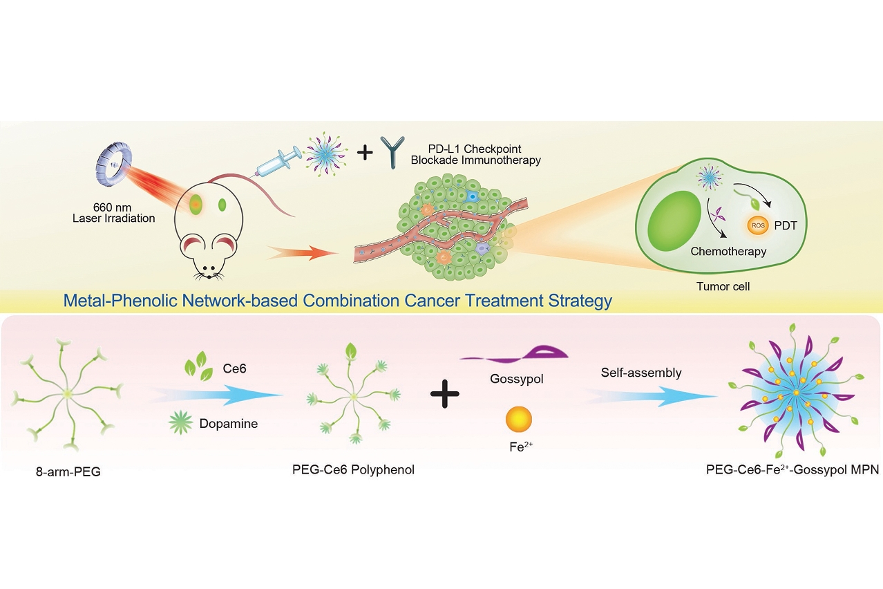 研究團將提取於棉花種子的天然多酚-棉酚與通過化學合成的具有光敏性質的卟吩-多酚衍生物相結合,使其與金屬配位而形成具有穩定結構的金屬-多酚多功能網絡。多酚廣泛存在於自然界的各種植物中,是植物體內的重要有機成分。其獨特的酚羥基結構及物理特性使其具有特定的生理功效,可應用於預防退行性疾病及對抗癌症等。此多酚納米藥物實現了腫瘤化療與光動力治療的巧妙結合。治療後通過促進腫瘤抗原遞呈細胞的成熟,抗腫瘤細胞因數的釋放等作用,有效增強了基於PD-L1檢查點抑制的腫瘤免疫療法,實現“多專多能”啟動免疫應答,從而有效抑制腫瘤的生長和轉移。
