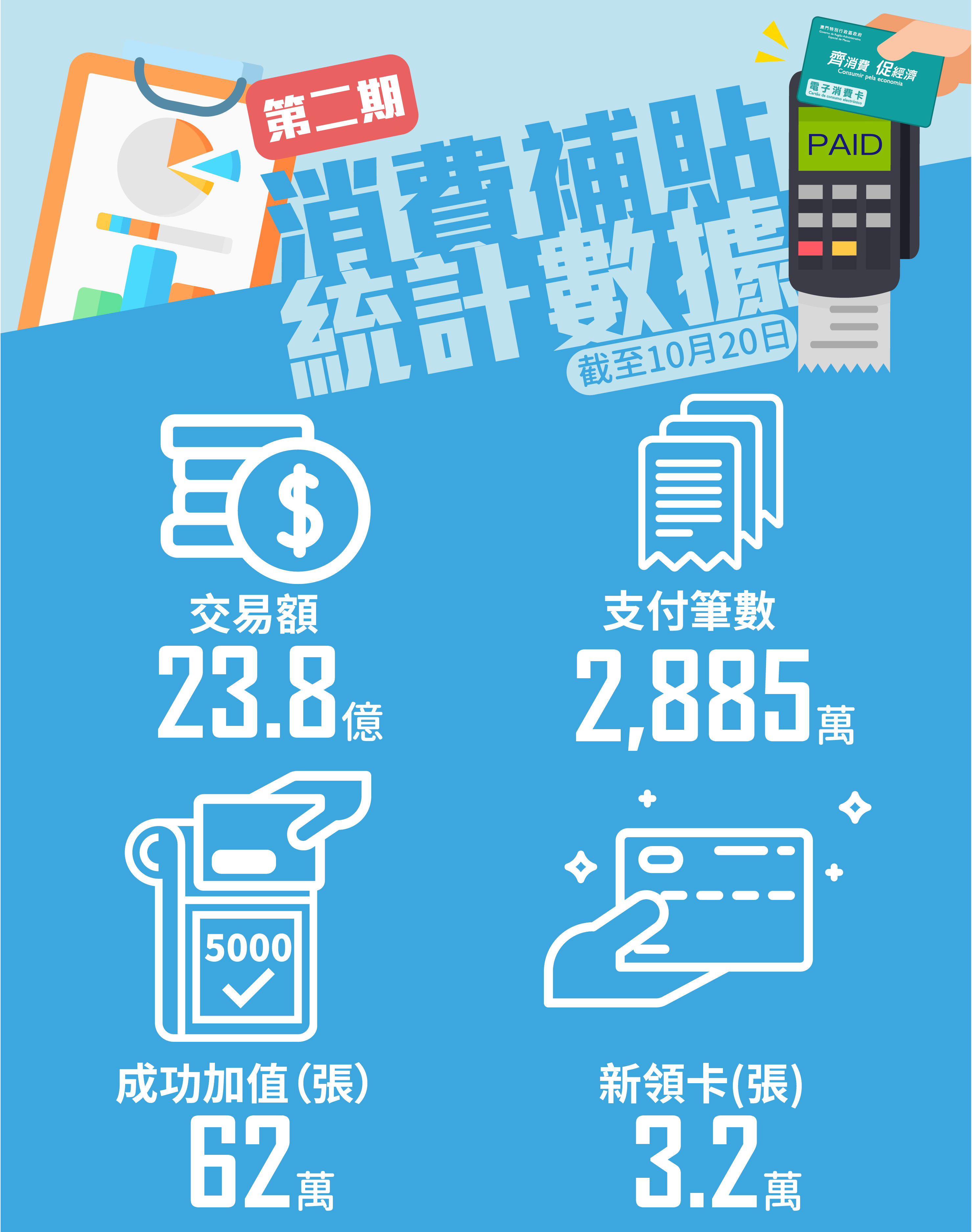 第二期消費卡領取期為7月27日至12月14日,使用期為8月1日至12月31日。截至10月20日,約62萬張消費卡已完成加值,佔第一期已領卡數目(62.4萬張)的超過99%。連同約3.2萬張新卡已被領取,超過65.2萬位居民已領取第二期消費卡。交易額超過23.8億澳門元,按交易金額計算,有約64%的消費補貼流入中小企。