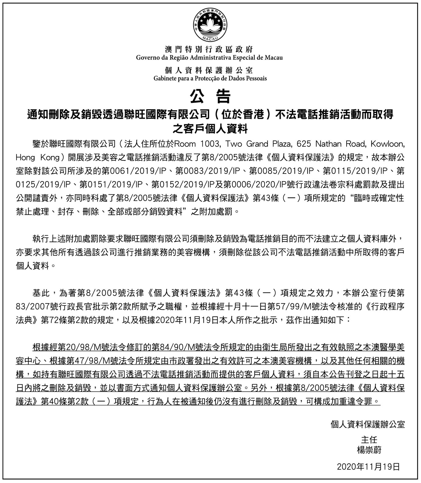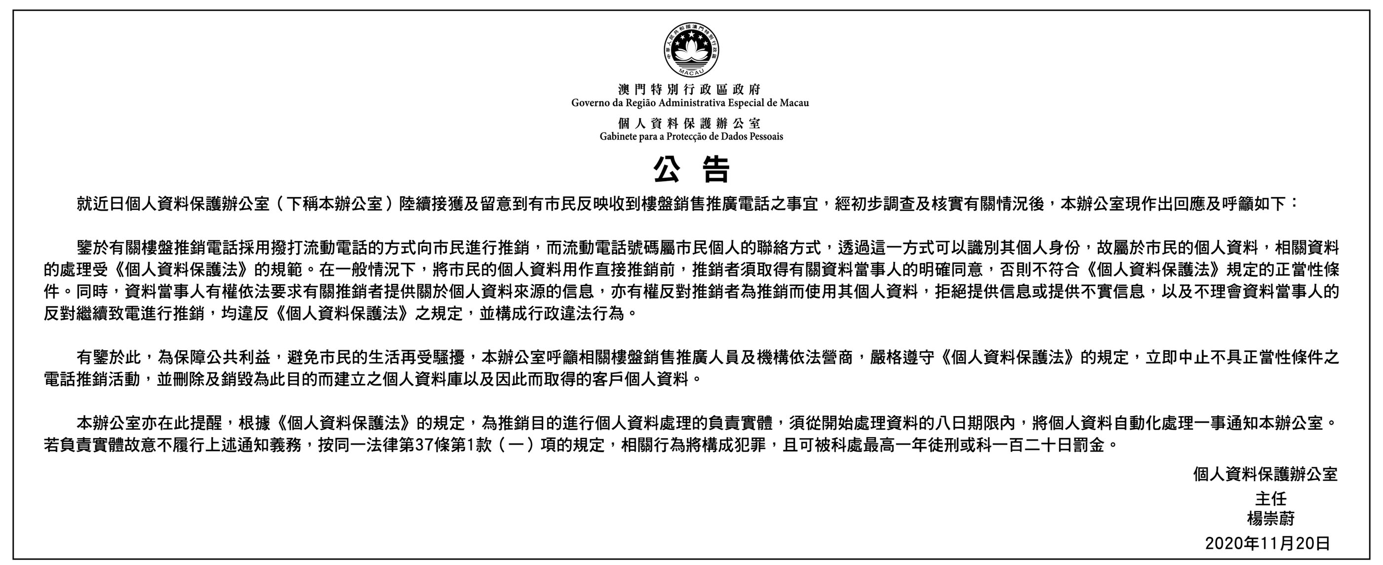 此外,個資辦近期發現有其它行業正採取類似的違法手段進行電話商業推銷活動。個資辦在此提醒各行業機構須尊重資料當事人的權利,停止一切違反《個人資料保護法》的電話推銷行為,否則將承擔相應的法律責任。