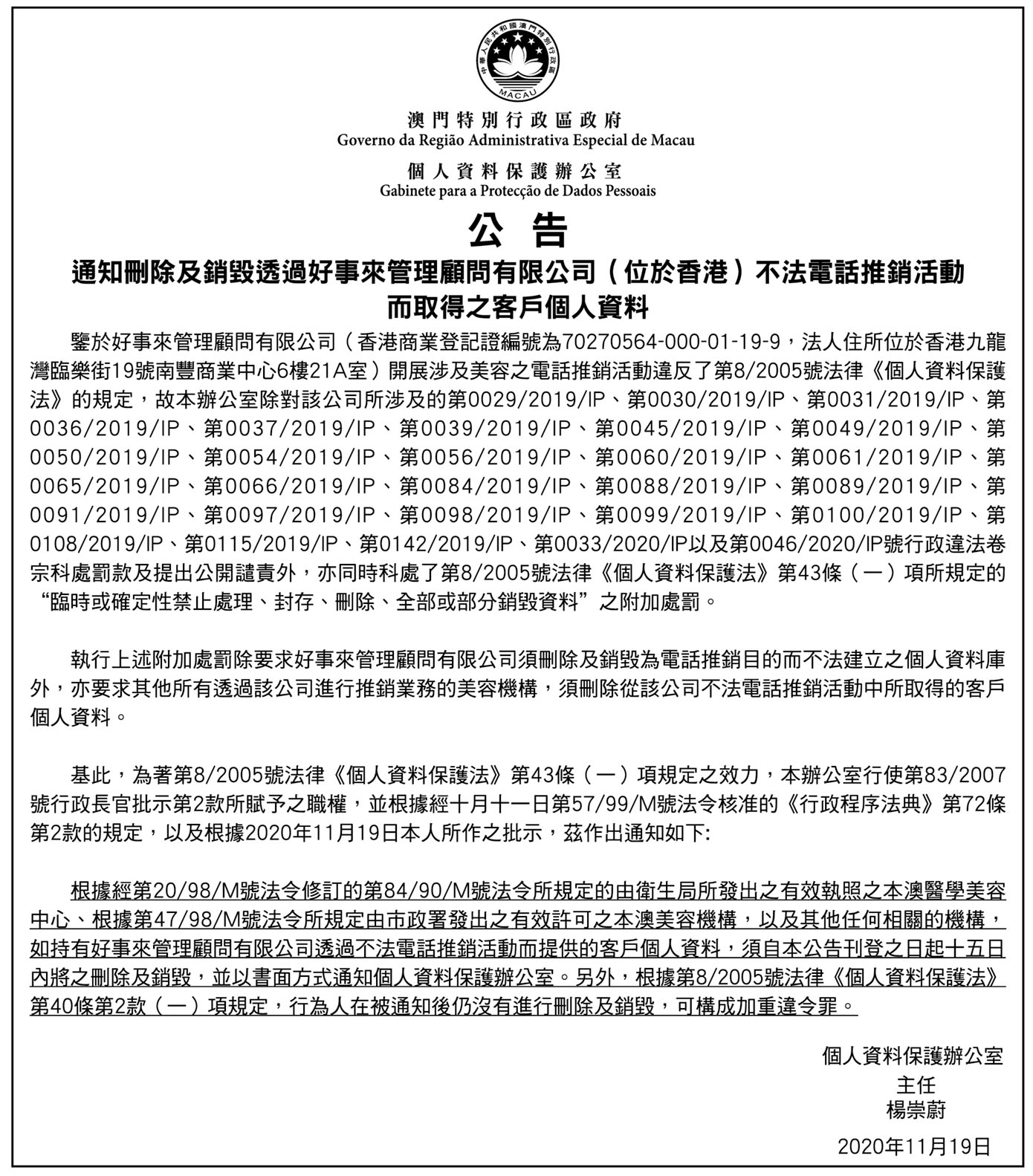 就上述事宜,個資辦今天在一份中文及一份葡文報章上刊登多份公告,分別執行多個附加處罰及提醒相關機構依法營商。
