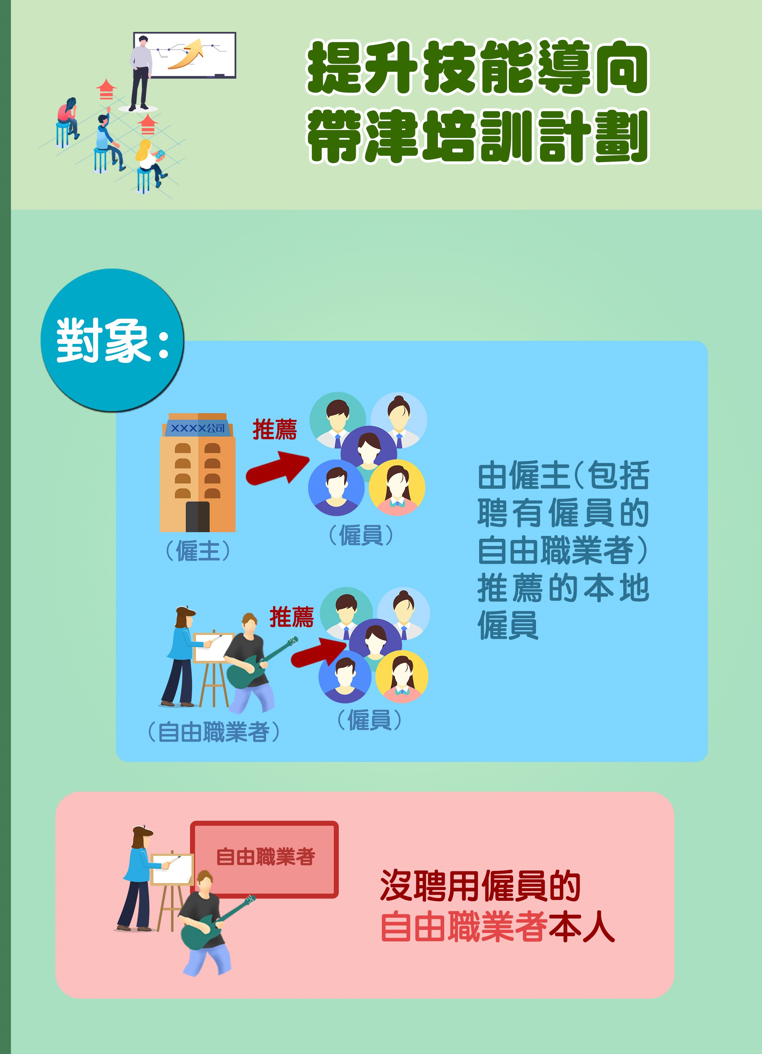 “提升技能導向帶津培訓計劃”由僱主安排其僱員在正常工作時間內參加培訓計劃,由推薦計劃至完成培訓課程期間,沒有降低相關僱員的基本報酬,亦沒有與其協商安排無薪假,按每一名完成培訓並參加考核的僱員計算,僱主可獲發放5,000澳門元的培訓津貼;如僱主安排原已處於無薪假的僱員參加培訓計劃,或自由職業者本人參加培訓計劃,則有關僱員或自由職業者於完成培訓及參加課程考核後,可獲發5,000澳門元的培訓津貼。