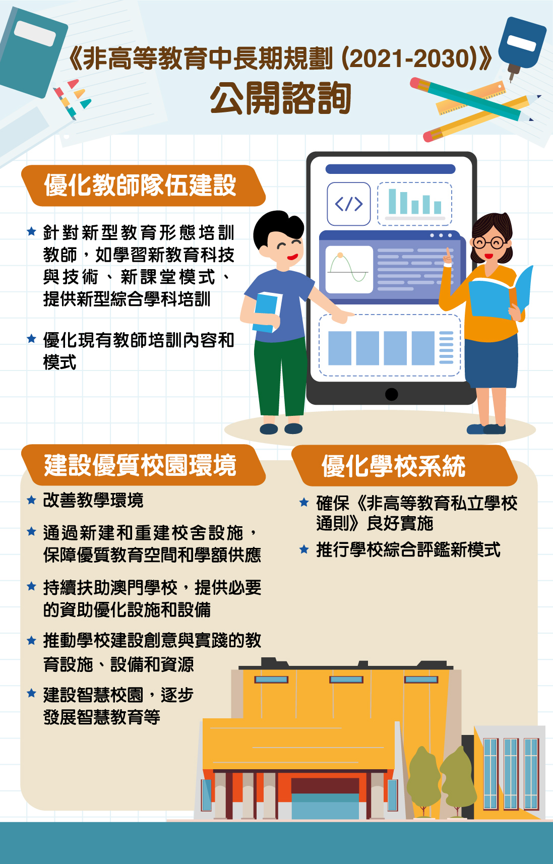 澳門特別行政區政府首個教育發展規劃《非高等教育發展十年規劃(2011-2020年)》(下稱《十年規劃》)包括了“優先發展教育”、“邁向高品質高公平教育系統”、“推動課程與教學改革”、“建設專業師資隊伍”等目標,賦予頂層設計和指導性的意義。政策實施以來,各項工作有序進行,通過社會各界努力,近年教育水平整體得到一定的提升。由於《十年規劃》接近尾聲,為長遠規劃澳門非高等教育的發展,教育暨青年局參考各地教育規劃文件和政策,總結《十年規劃》實施的經驗,並結合本地教育發展現況及未來需求,擬定了《非高等教育中長期規劃(2021-2030)》諮詢文本,並將於2020年12月5日至2021年1月22日向公眾諮詢意見。