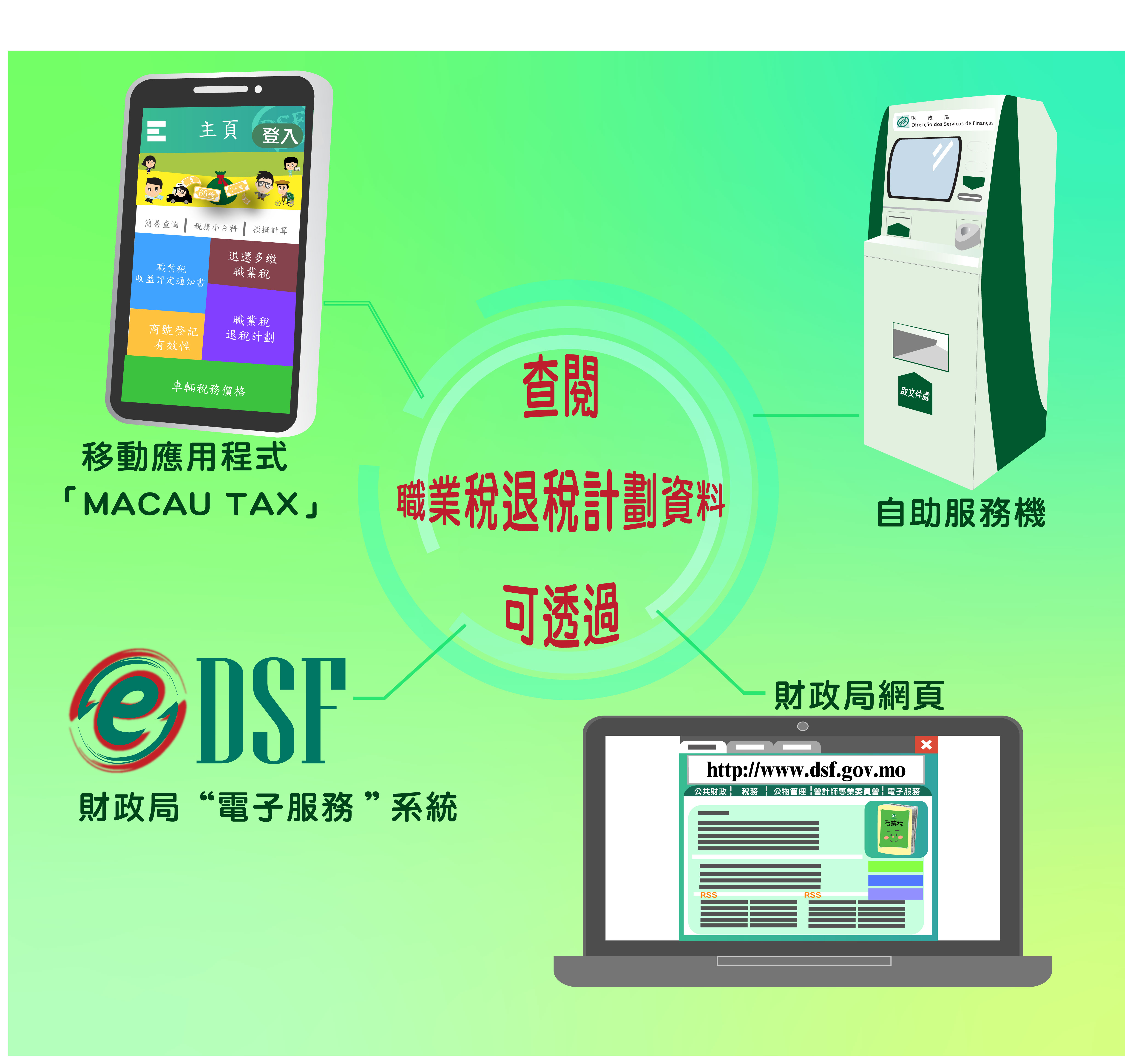 此外,納稅人可透過自助服務機、財政局“電子服務"系統及移動應用程式 「MACAU TAX」(僅限已登記用戶),又或者財政局網頁稅務欄內之稅務資料查詢,查閱職業稅退稅計劃資料。