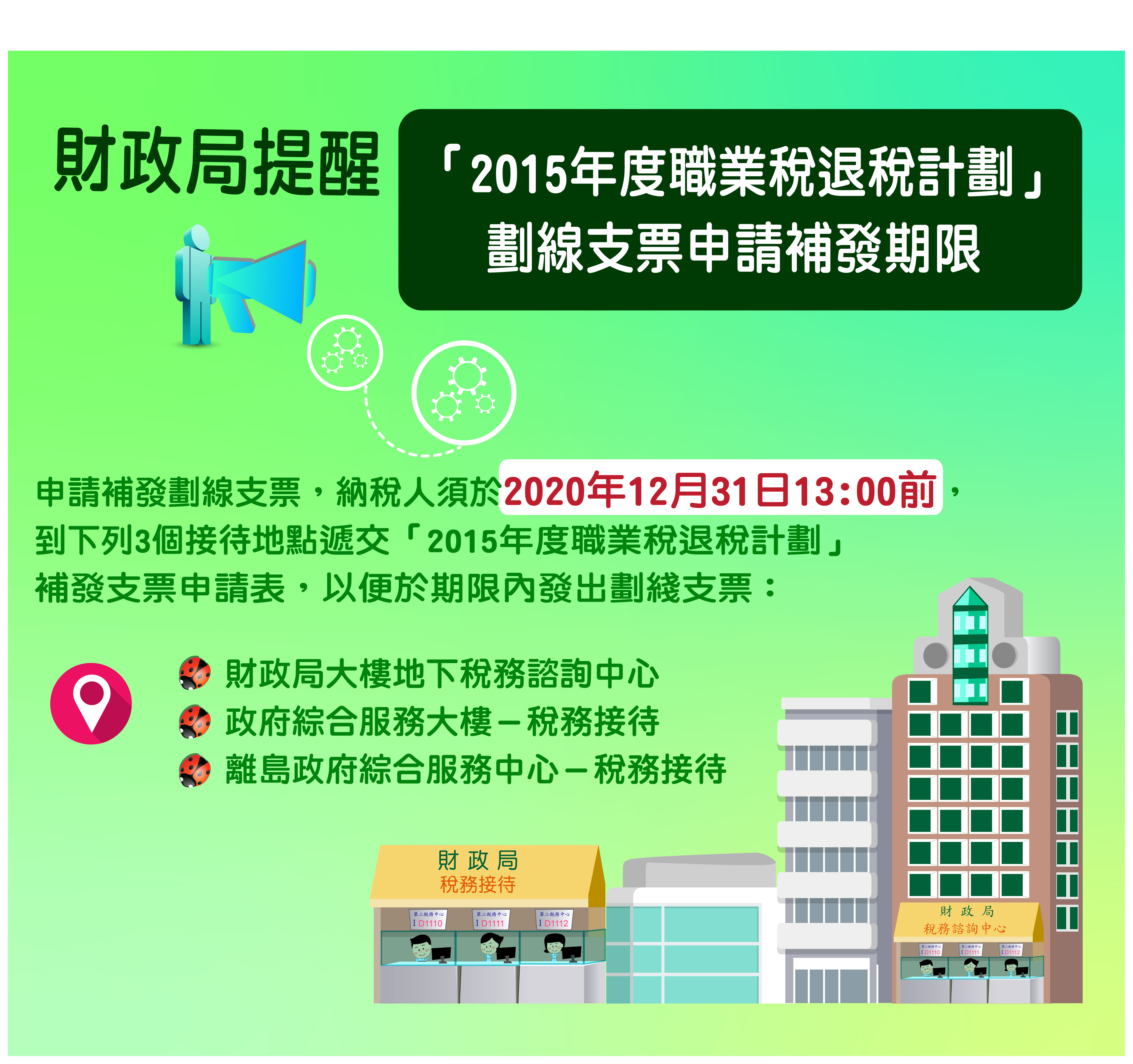補發該年度劃線支票,納稅人須於2020年12月31日13:00前,到下列三個接待地點,包括:(1)財政局大樓地下稅務諮詢中心、(2)政府綜合服務大樓-稅務接待、(3)離島政府綜合服務中心-稅務接待,遞交「2015年度職業稅退稅計劃」補發支票申請表,以便能於期限內發出劃線支票。